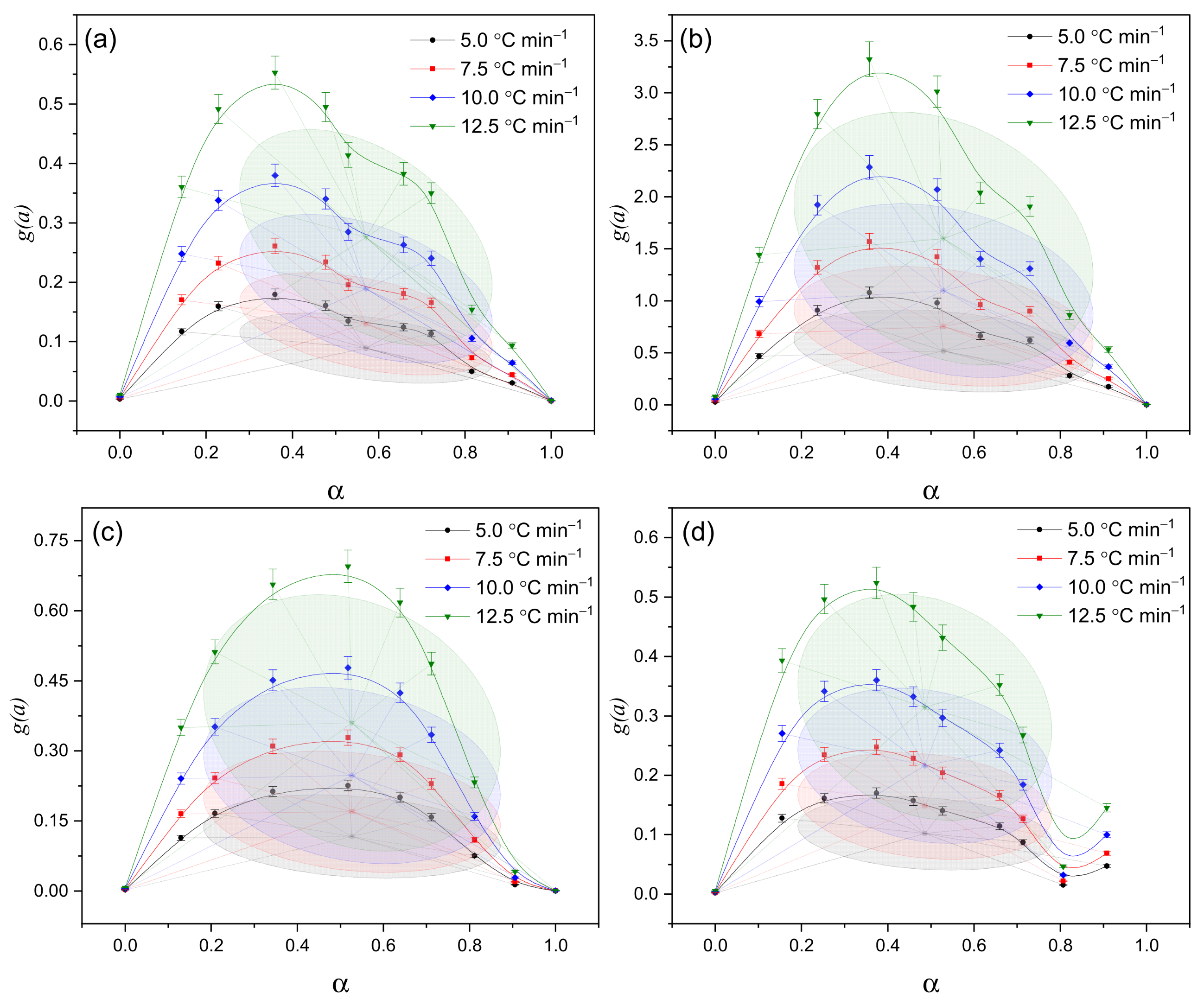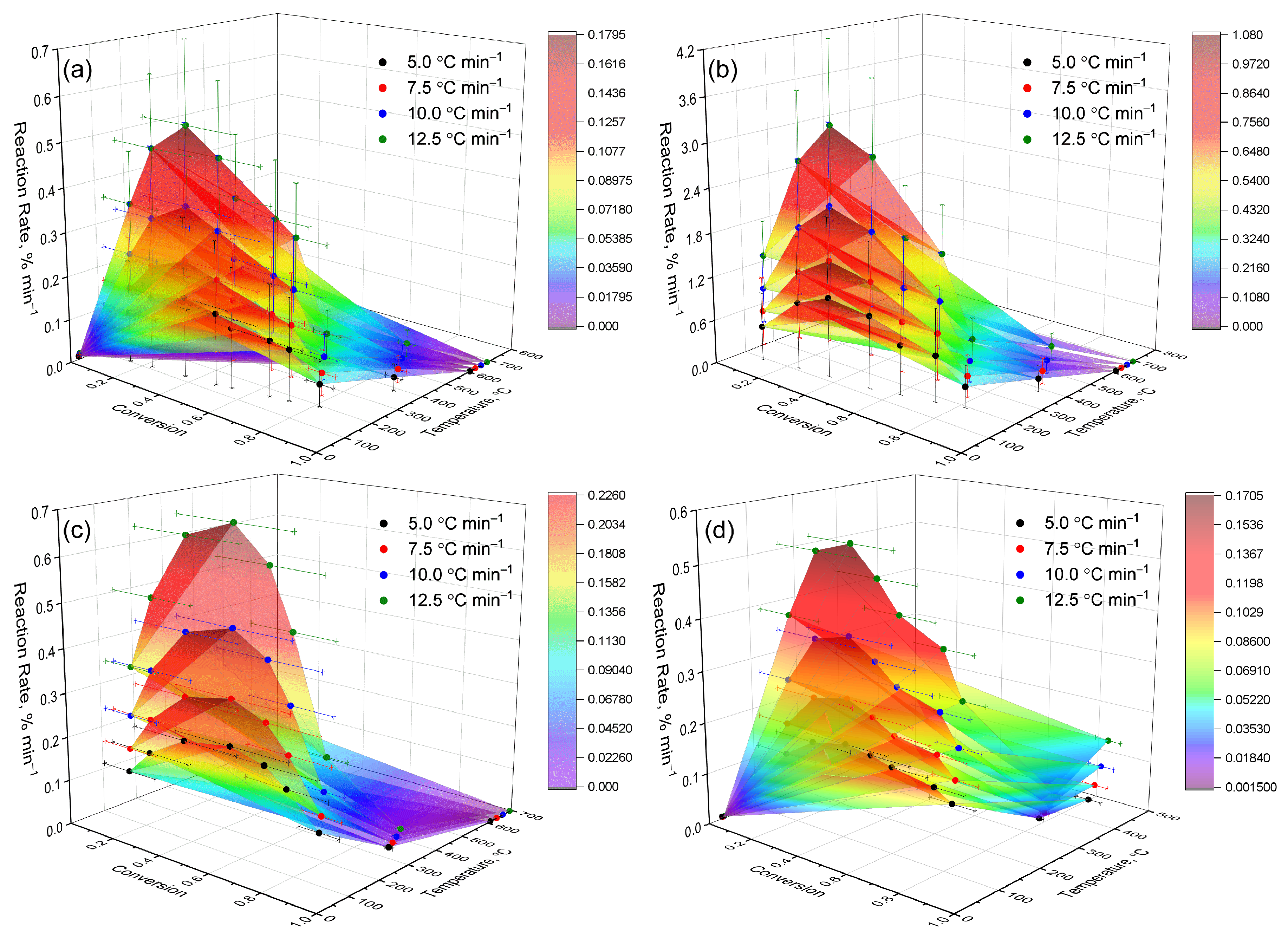 Figure 8) confirm the previously identified distinctions between the samples. In sample (c), the process is diffusion-limited, meaning that the movement of volatile products slows down the overall reaction rate. In sample (d), the reaction proceeds more gradually and remains active over an extended range of conversion, indicating a prolonged and continuous decomposition process. In contrast, sample (a) exhibits a simplified kinetic behavior with moderate reactivity, corresponding to an almost single-stage process with minimal complexity.