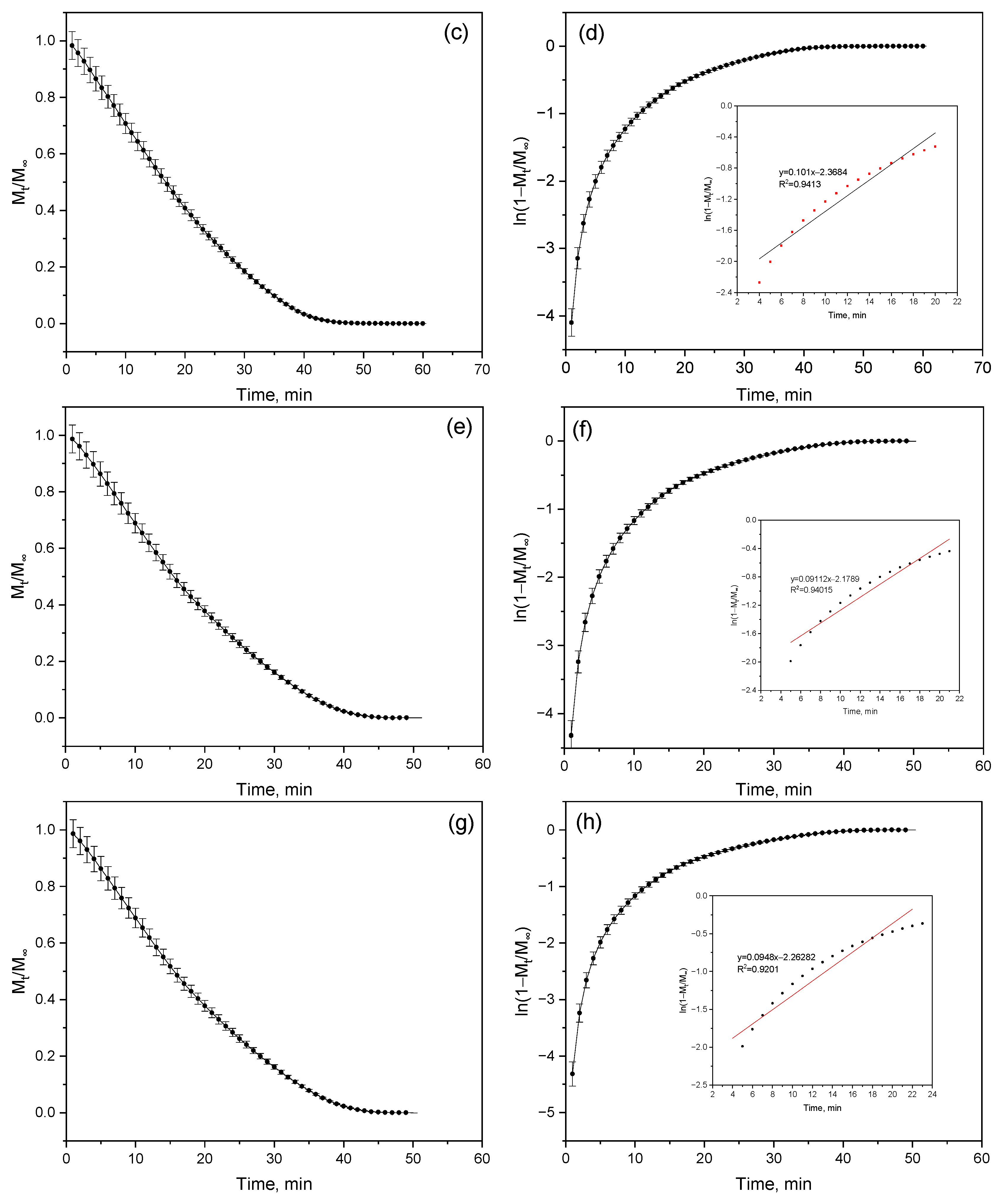 Table 4) revealed significant differences in the stability and decomposition mechanism of hydrogels. To compare these results with the behavior in a humid environment, the dehydration kinetics characterizing the moisture retention capacity and structure of the polymer network were additionally studied. Quantitative analysis was performed using linear approximation of experimental data in time coordinates based on the analytical solution of Fick’s equation. The slope of the approximated straight-line k was used to calculate the effective diffusion coefficient D using the expression: