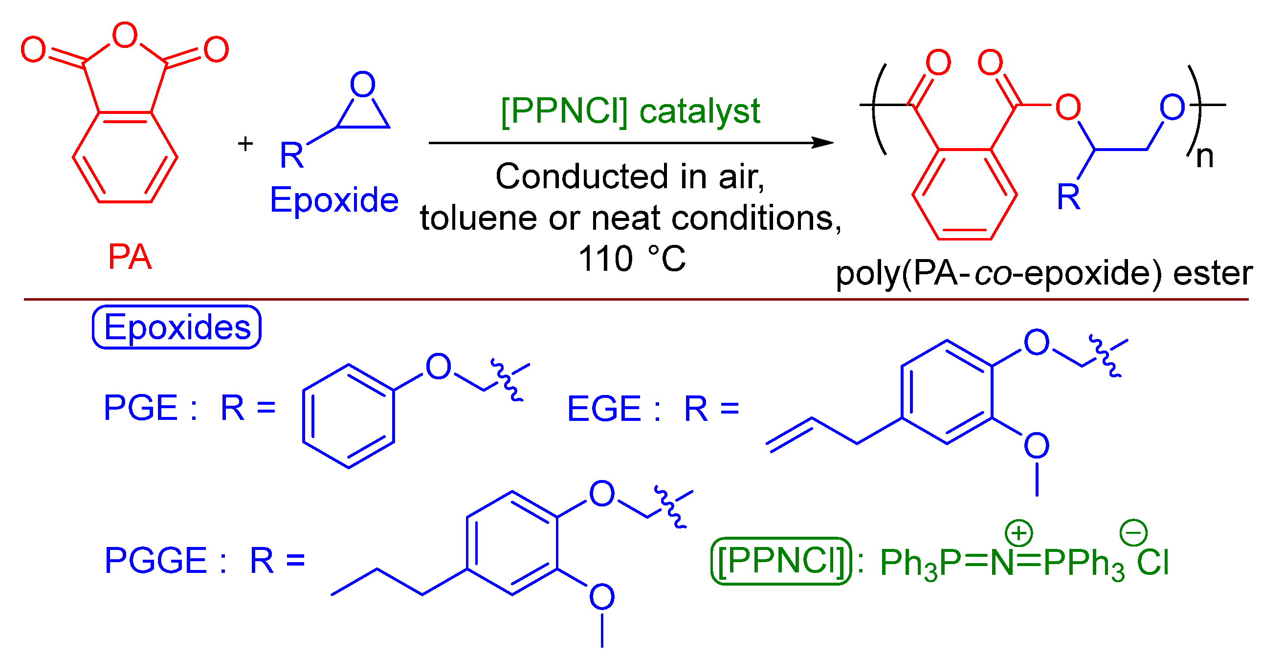 - Kummari, A.; Pappuru, S.; Chakraborty, D. Fully Alternating and Regioselective Ring-Opening Copolymerization of Phthalic Anhydride with Epoxides Using Highly Active Metal-Free Lewis Pairs as a Catalyst. Polym. Chem. 2018, 9, 4052–4062. [Google Scholar] [CrossRef]