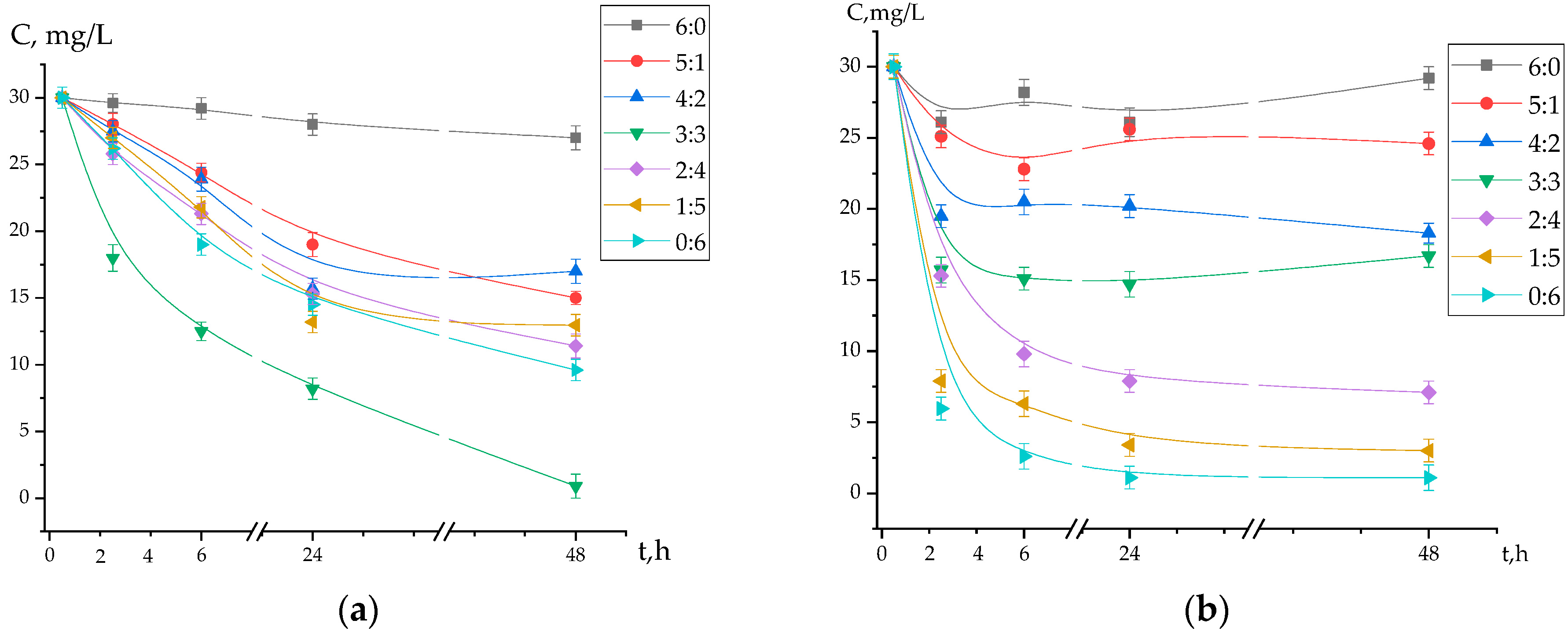 3.3. Polymer Chain Binding Degree (θ) of Iron Ions by the Interpolymer System