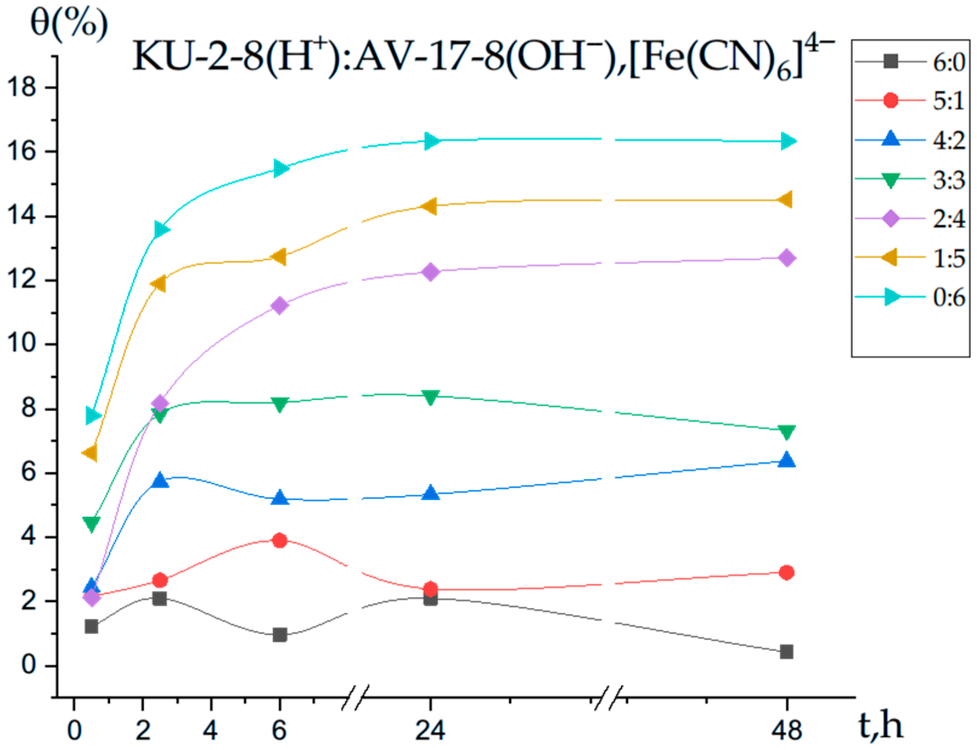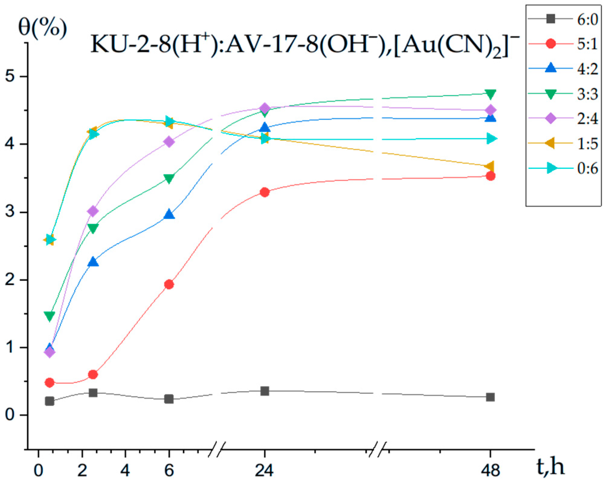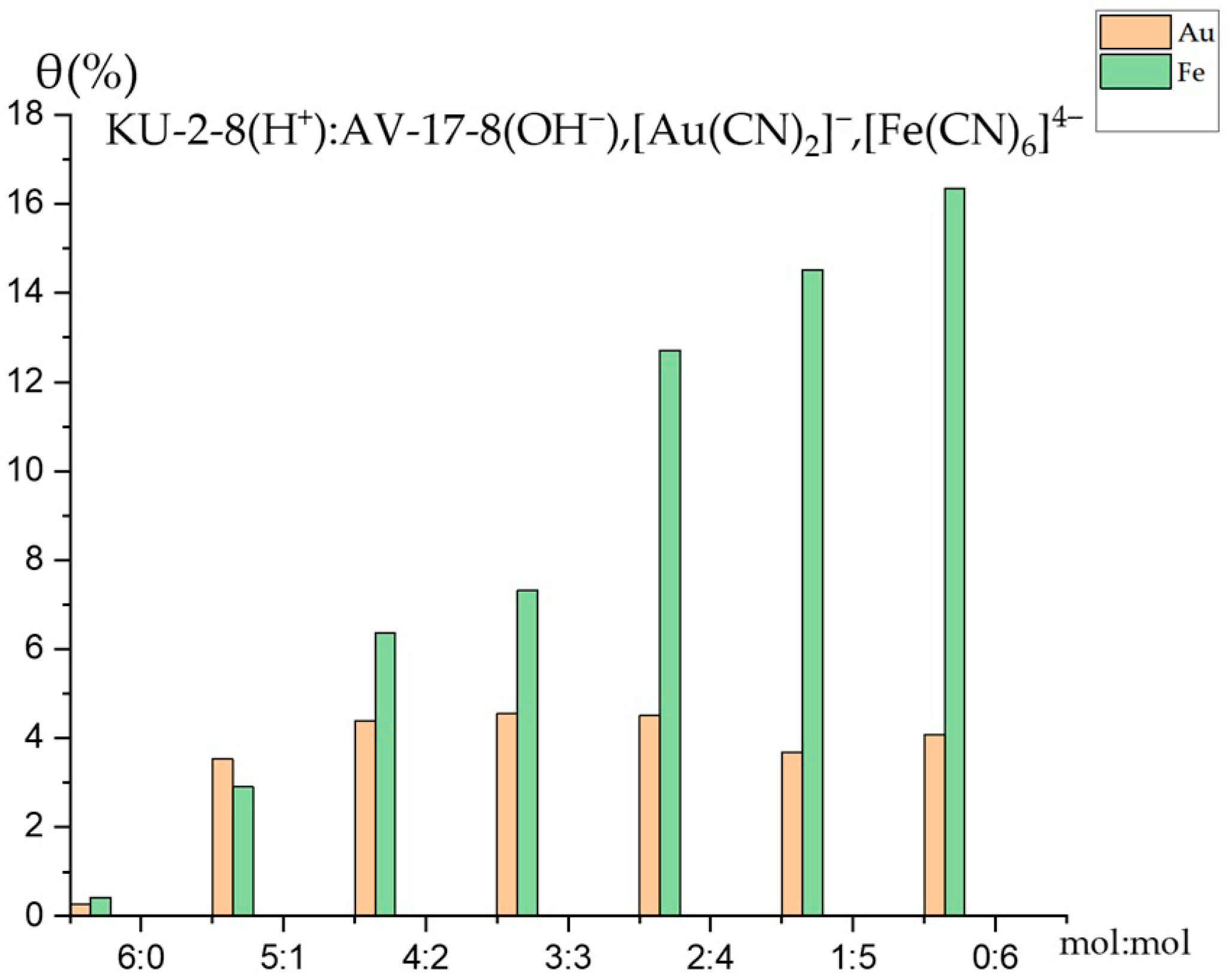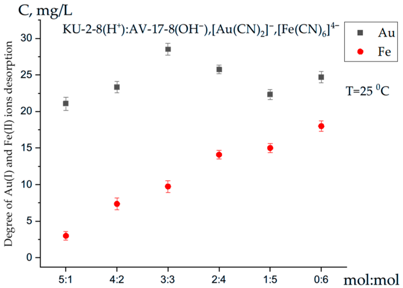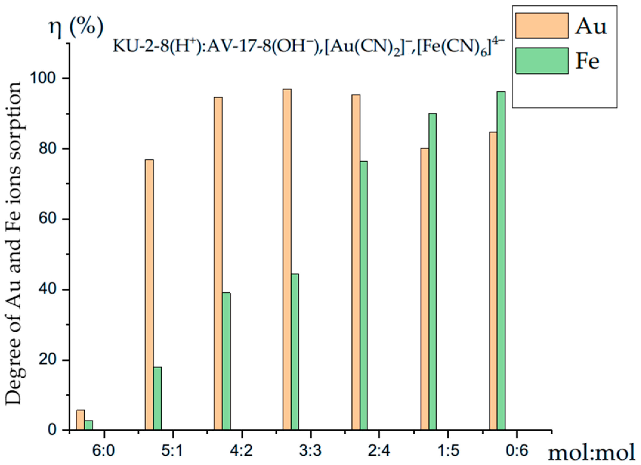 3.4. Competitive Sorption of the Gold and Iron Ions by the Interpolymer System KU-2-8(H+):AV-17-8(OH−)