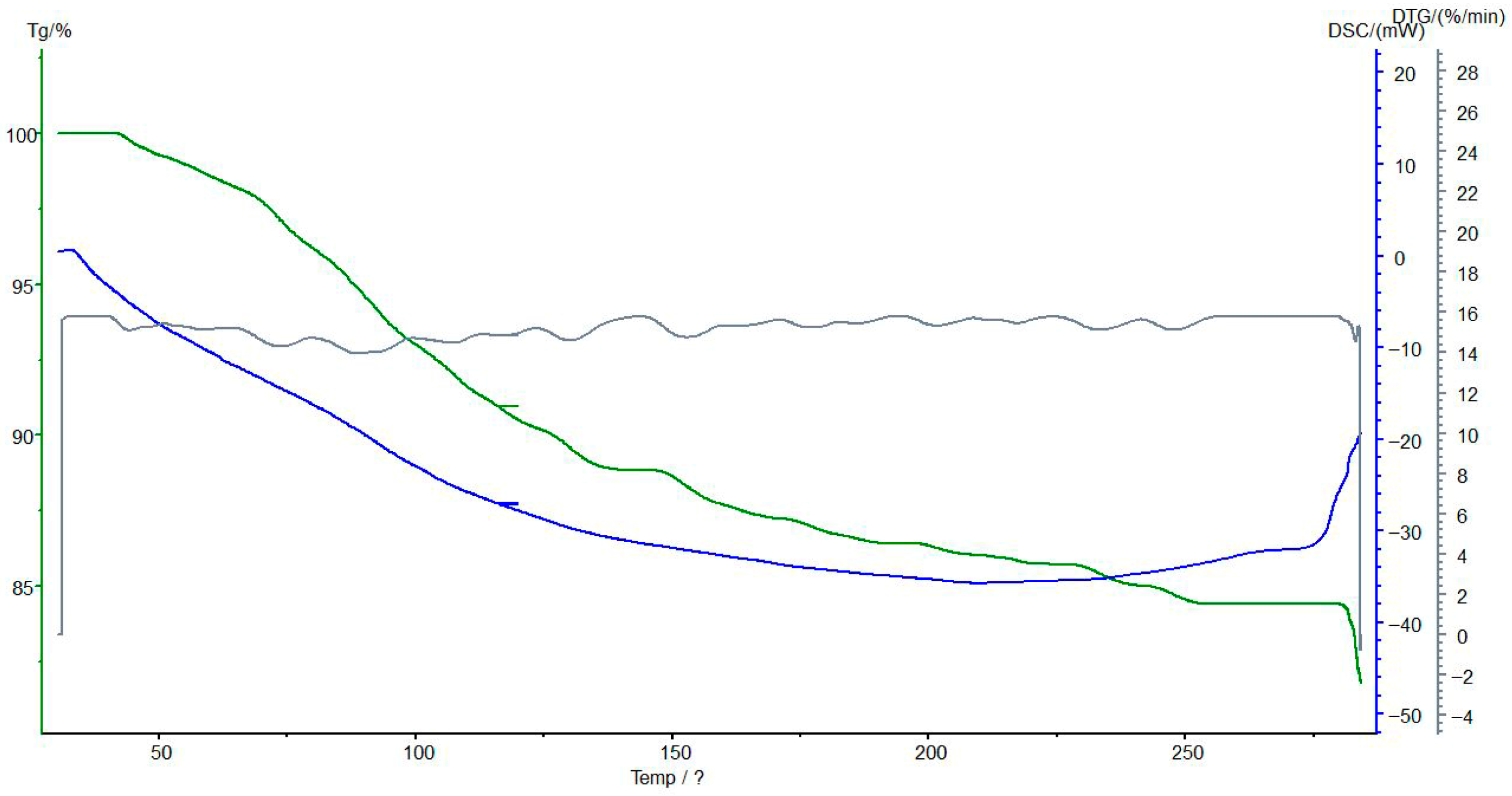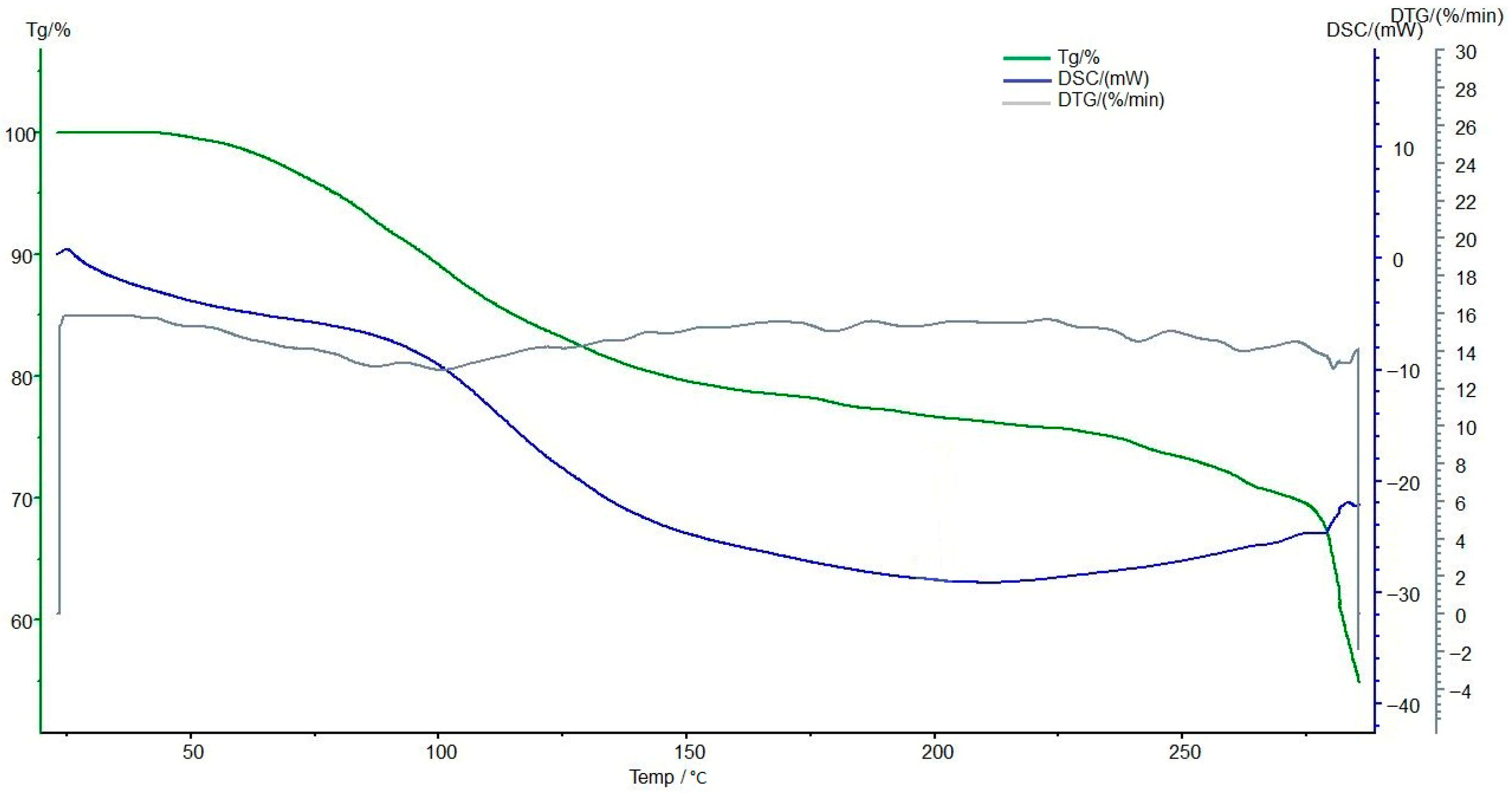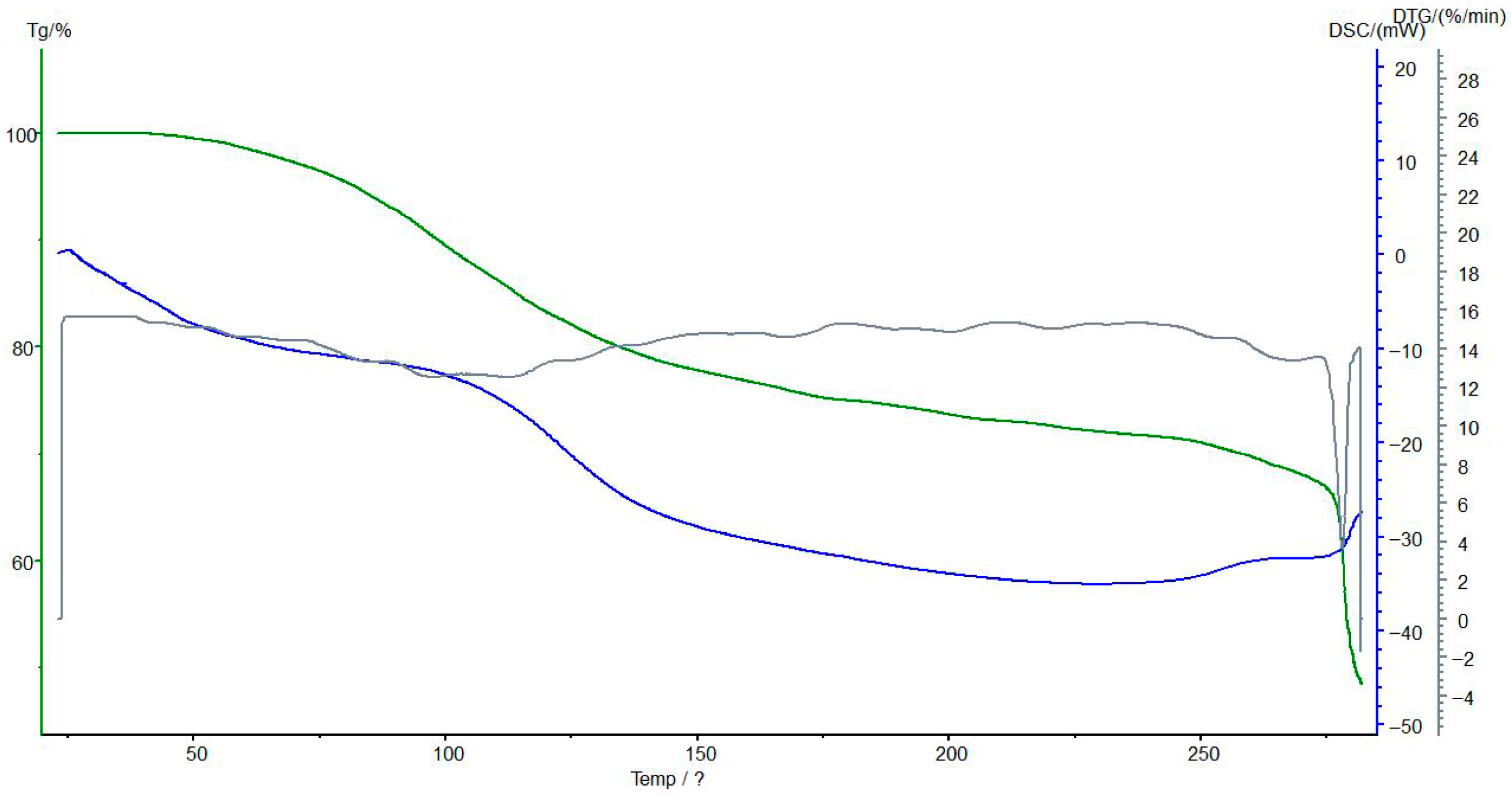 3.7. Thermogravimetric and Differential Scanning Calorimetric Analyses of the Interpolymer System KU-2-8(H+):AV-17-8(OH−) (3:3) and Its Complexes