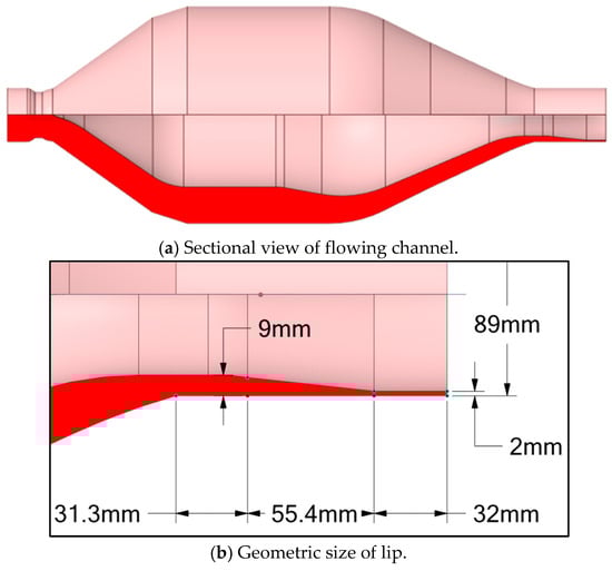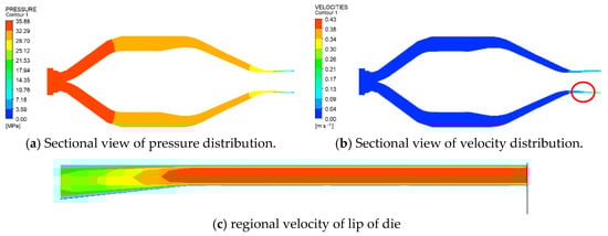 As the molten PVC flows from the screw/barrel system to the extrusion die, the pressure, temperature, and velocity distributions are numerically calculated using ANSYS Polyflow. Depicted for an inlet rate of 500 kg/h and a screw rotational speed of 43 rpm, the two-dimensional pressure distribution of molten PVC within the extrusion die is shown in Figure 10a. From the inlet to the outlet of the extrusion die, the pressure of the molten material decreases, which facilitates an increase in the flow velocity, as illustrated in Figure 10b. Consequently, the sectional area of the flow channel within the extrusion die gradually reduces, while the flow velocity increases to 0.04 m/s. A regional view of the die lip, shown in Figure 10c, reveals a significant decrease in pressure and an increase in the molten velocity at the die lip. Figure 11 demonstrates a linear correlation between the inlet pressure and the outlet flow rate of the extrusion die, with the inlet pressure increasing in response to higher outlet rates. Figure 12 further illustrates that the extrusion velocity at the die lip increases as the outlet rate increases. The extrusion velocity at the die lip ranges from 0.19 to 0.26 m/s as the outlet rate increases from 360 to 500 kg/h.