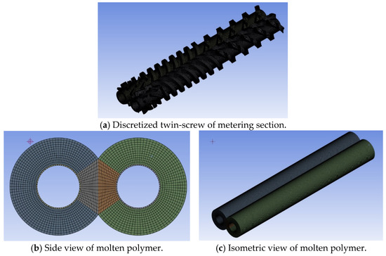 Three-dimensional modeling of the screw, barrel, and mold was performed using Creo Parametric 6.0.2.0 (Boston, MA) (https://www.ptc.com/en/products/creo/parametric, 20 October 2025). A geometric representation of the metering section of the counter-rotating twin-screw is shown in Figure 1. Subsequently, the melt flow domain was discretized using ANSYS 2024R1 (https://www.ansys.com/, 20 October 2025), and the ANSYS Polyflow module was employed to define the initial and boundary conditions before conducting a simulation analysis. The function of the currently used software is limited to analyzing fully molten materials, and, therefore, the metering section of the screw, as depicted in Figure 1, was considered for analysis. Figure 1b,c illustrate the metering section of the screw, which consists of three distinct configurations for kneading, compressing, and mixing. The lengths of these configurations are 345 mm, 302.5 mm, and 80 mm, respectively, with a gap of 20 mm between the compressing and mixing configurations. Figure 1d shows the kneading configuration, with a thread width of 22.2 mm, a height of 16.5 mm, a pitch of 210 mm, and three threads. Circular overflow grooves were incorporated into the threads to enhance the kneading effect; these grooves had diameters of 9 mm and depths of 4.5 mm, along with groove pitches of 35 mm. The molten volume in this kneading configuration was 1334.79 cm3 during compounding. The compressing configuration, as is shown in Figure 1e, was trapezoidal in shape with three threads. It had a lower base of 16.2 mm, an upper base of 13.2 mm, a height of 16.5 mm, and a pitch of 120 mm. The molten volume in this configuration was 1380.08 cm3. The mixing configuration, as is depicted in Figure 1f, was rectangular, with a width of 8 mm, a height of 16.5 mm, and a pitch of 392 mm. The molten volume in this mixing configuration was 737.34 cm3.