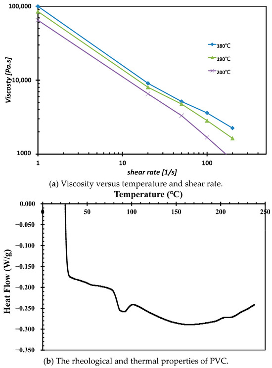 The viscosity of PVC at different shear rates was analyzed using GÖTTFERT’s rheograph, as shown in Figure 4a. In Figure 4b, PVC was characterized using a differential scanning calorimetry (DSC) instrument (TA Instruments Discovery DSC 25, Delaware, USA) under a nitrogen atmosphere. The sample was heated to 240 °C at a ramp rate of 10 °C/min. The results indicated a starting melt temperature of approximately 78 °C, with a peak melting temperature occurring at 88 °C. The PVC material properties used in the analysis are summarized in Table 1. The compounding conditions for both the extruder and die are outlined in Table 2, with the screw rotational speed set to 43 rpm and the inlet extrusion rate specified. The outlet was configured to have no additional normal or tangential velocities, and no-slip conditions were applied to the barrel wall, ensuring that the melt had no relative or tangential velocity at the barrel wall.