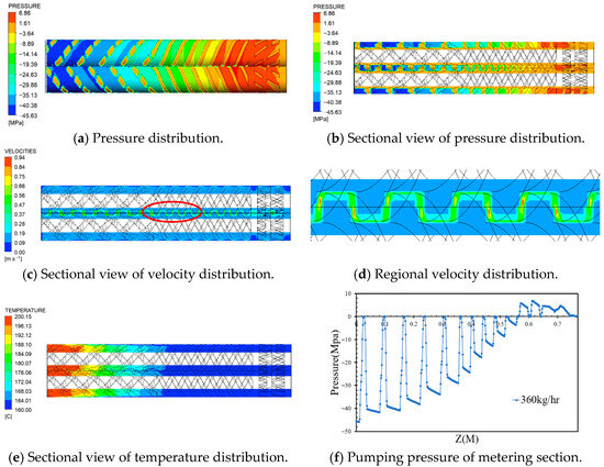 To investigate the influence of the screw rotation speed and inlet flow rate on the pressure, velocity, and temperature distributions of molten PVC within the metering section of the screw and barrel system, a series of simulations were conducted using ANSYS Polyflow 2024 R1. The barrel temperature was maintained at 200 °C in the kneading section of the metering zone and at 160 °C in the compressing and mixing sections. The twin-screw extruder operated at a counter-rotating speed of 43 rpm, while the inlet flow rate of molten PVC ranged from 360 to 500 kg/h. At an inlet rate of 360 kg/h and a screw speed of 43 rpm, the pumping pressure within the metering section was 45.63 MPa, as shown in Figure 5a,b. The outlet pressure at the screw/barrel interface was set to zero in the simulation to calculate the inlet pressure, with the absolute value representing the pumping pressure. The pumping pressures for the kneading and compressing sections were approximately 15 MPa and 30 MPa, respectively, while the pressure loss in the mixing section was 6.86 MPa. Figure 5c,d illustrate the velocity of the molten material in the inter-screw region, influenced by the counter-rotating motion. Stagnation zones were identified near the barrel wall, particularly around the mixing section. Figure 5e shows the temperature distribution, where the melt temperature decreases gradually from 200 °C to 160 °C from the kneading to the mixing configurations. Finally, Figure 5f presents the variation in molten pressure within the inter-screw region, showing pressure fluctuations in relation to the screw threads, as derived from the data presented in Figure 5b.