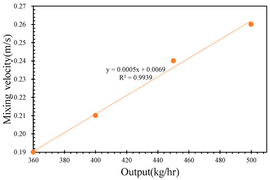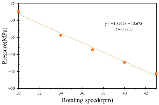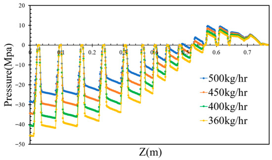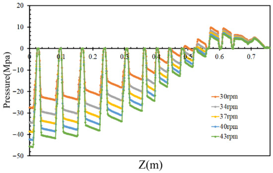 By varying the inlet flow rates to 400, 450, and 500 kg/h while maintaining a constant screw rotational speed of 36 rpm, the pressures of the molten PVC in the inter-screw region, which typically fluctuate with respect to the screw threads, were derived, as shown in Figure 6. Additionally, the pressure loss in the mixing section slightly increased with respect to the inlet flow rate of molten PVC. As the outlet pressure was assumed to be zero, the pumping pressure decreased with an increase in the inlet flow rate. Figure 7 further demonstrates that, within the metering section, the pumping pressure was linearly proportional to the outlet flow rate of molten PVC at a screw rotational speed of 43 rpm. At an inlet rate of 360 kg/h, simulations were performed at screw rotational speeds of 43, 40, 37, 34, and 30 rpm. The results showed that the pumping pressure in the metering section increased at higher screw rotational speeds. As depicted in Figure 8, the pressures in the inter-screw region of the counter-rotating twin-screw also increased with respect to the screw rotational speed at the same inlet flow rate of 360 kg/h. The pressure loss in the mixing section exhibited a negative correlation with the screw rotational speed, indicating that a higher screw speed reduces the pressure loss. Furthermore, as shown in Figure 9, an increase in the screw rotational speed led to a corresponding increase in the pumping pressure within the metering section.