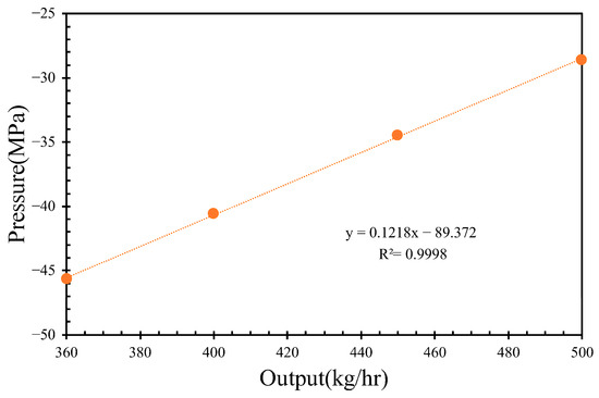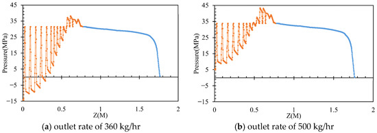 A quantitative evaluation of screw compounding and extrusion die performance is demonstrated in Figure 7, Figure 9 and Figure 11. In Figure 12, the extrusion velocity at the die lip is 0.19 m/s at an outlet rate of 360 kg/h. The corresponding inlet pressure of the extrusion die at this outlet rate is 31.8 MPa, as shown in Figure 11. At a screw rotational speed of 32 rpm, the pumping pressure of molten PVC is 32 MPa, as depicted in Figure 9. By connecting the pressure of the molten PVC in the metering section to the extrusion die pressure, a pressure drop of −15 MPa at the entrance of the metering section is derived to facilitate the suction of molten PVC, as illustrated in Figure 13a. At an inlet rate of 500 kg/h, the inlet pressure of molten PVC for the extrusion die is 34 MPa. However, as shown in Figure 13b, the pumping pressure in Figure 6 is only 29 MPa, which is less than the required pressure of 34 MPa. To achieve optimal pressure alignment between the compounding screw and the extrusion die, the optimal outlet rate is found to be 439 kg/h at a screw rotational speed of 43 rpm.