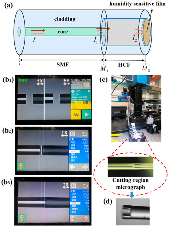 FPI humidity fiber sensor and fabrication process of SMF–HCF cascade-spliced structure. (a) Schematic diagram of FPI optical fiber humidity sensor structure based on humidity sensitive material; microscope (b1–b3) Diagrams of fusion splicing process; (c) Real-time cutting and monitoring system; (d) practical sensing probe.