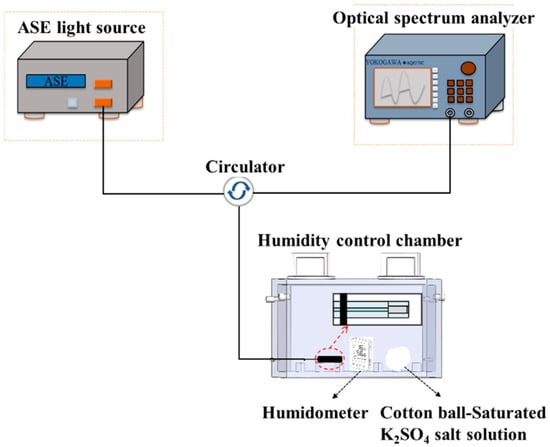 The humidity sensing evaluation system, schematically depicted in Figure 3, comprised an ASE broadband light source (KG-ASE-CL-D-13-FC/APC, Kangguan Technology Co., Ltd., Shenzhen, China, 1528–1603 nm wavelength range), an OSA, and a custom 2 L hermetic chamber to place the FPI sensor probe, a digital hygrometer (0.1% RH resolution), and humidity-regulating saturated K2SO4 solution. Relative humidity (RH) modulation was achieved through controlled evaporation from K2SO4-impregnated cotton balls, with the hygrometer providing real-time RH calibration adjacent to the sensing probe.