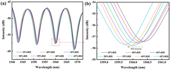 Post-processing of spectral data involved the Savitzky–Golay smoothing algorithm and recording the wavelength of a special resonance dip. The Savitzky–Golay smoothing algorithm was adopted in the Origin 2024 software with the window size of 5 points and the second-order polynomial fitting to eliminate the random noise signals. Figure 4a illustrates the characteristic interference spectra across the 35–65% RH range, exhibiting progressive wavelength shifts and fringe visibility changes correlating with PMMA film hydration states. This systematic characterization methodology ensures the quantitative evaluation of humidity sensitivity while minimizing environmental interference factors. It should be noted that the broadband light source and frequency-domain interference spectrum used in this experiment can facilitate the evaluation of static parameter information, such as sensitivity and interference spectrum quality of the sensing probe. In the practical application of the fiber optic humidity sensor, a narrowband laser with a specific wavelength will be used as the light source and the interfering intensity at this fixed wavelength will be real-time traced by the fast photodetector to calculate the humidity fluctuation.
