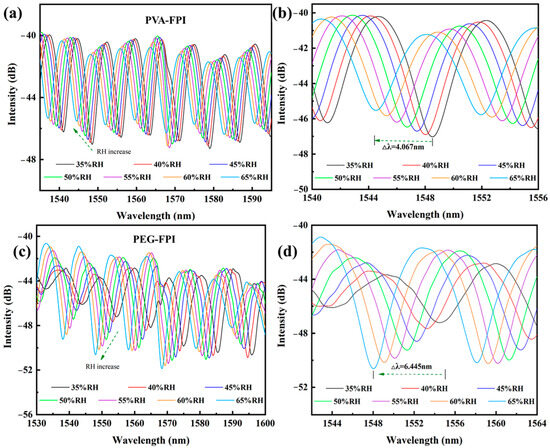 Humidity sensing characteristics of PVA-FPI (a,b) and PEG-FPI (c,d) humidity sensors.