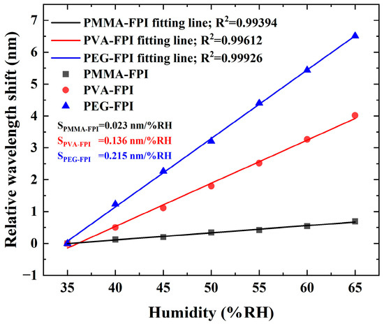 To quantitatively compare humidity responsiveness, the linear regression analysis was applied to trough wavelength displacements from localized spectra (Figure 4b and Figure 5b,d). Figure 6 presents the normalized sensitivity curves for all three type sensors, where the sensitivities are 0.023 nm/%RH (R2 = 0.99394) for PMMA-FPI, 0.136 nm/%RH (R2 = 0.99612) for PVA-FPI, and 0.215 nm/%RH (R2 = 0.99926) for PEG-FPI. Depending on the resolution (20 pm) of OSA used in this experiment, the corresponding resolutions for three polymer materials are 0.870% RH, 0.147% RH, and 0.093% RH, respectively.