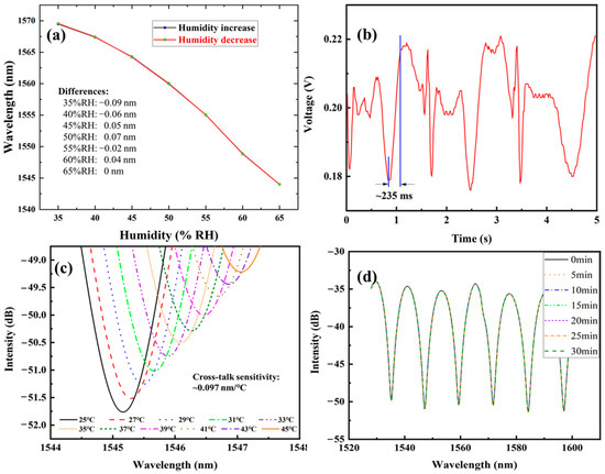 The humidity was increased from 35% RH to 65% RH, then decreased back to 35% RH; meanwhile, the wavelength location of one special interference was recorded. As Figure 7a shows, the hysteresis error ranges from 0.04 to 0.09 nm, exerting an uncertainty of 0.186–0.419% RH for the humidity measurement. To value the dynamic response, a 1550 nm laser was launched into the fiber sensor and an oscilloscope was used to record the real-time changes in light intensity. The humidity change was provided by the respiratory with the frequency of ~2.5 Hz. Figure 7b revealed the response time of ~235 ms. Environmental temperature will exert an impact on the humidity sensing performance. When the temperature changed from 25 °C to 45 °C, the wavelength underwent red-shift with a cross-talk sensitivity of ~0.097 nm/°C in Figure 7c. Compared to the humidity sensitivity, the introduced error is ~0.451% RH/°C. The temperature cross-sensitivity of the fiber optic humidity sensing system can be effectively compensated by introducing a temperature sensor into the fiber optic system to obtain the change in temperature, such as FBG, which is only sensitive to the ambient temperature. Then, based on the known temperature changes and temperature cross-sensitivity coefficient, the calibration quantity can be calculated to realize the temperature compensate and reduce its impact on optical interfering phase. Figure 7d shows the stability of the humidity sensor through continuous observation of the wavelength location for 30 min at the fixed temperature and humidity condition. The wavelength is relatively stable within 30 min, with a maximum fluctuation range of ~20 pm. According to the humidity sensitivity of 0.215 nm/% RH, this fluctuation corresponds to a relative humidity fluctuation of 0.093% RH, which can be ignored in most practical applications.