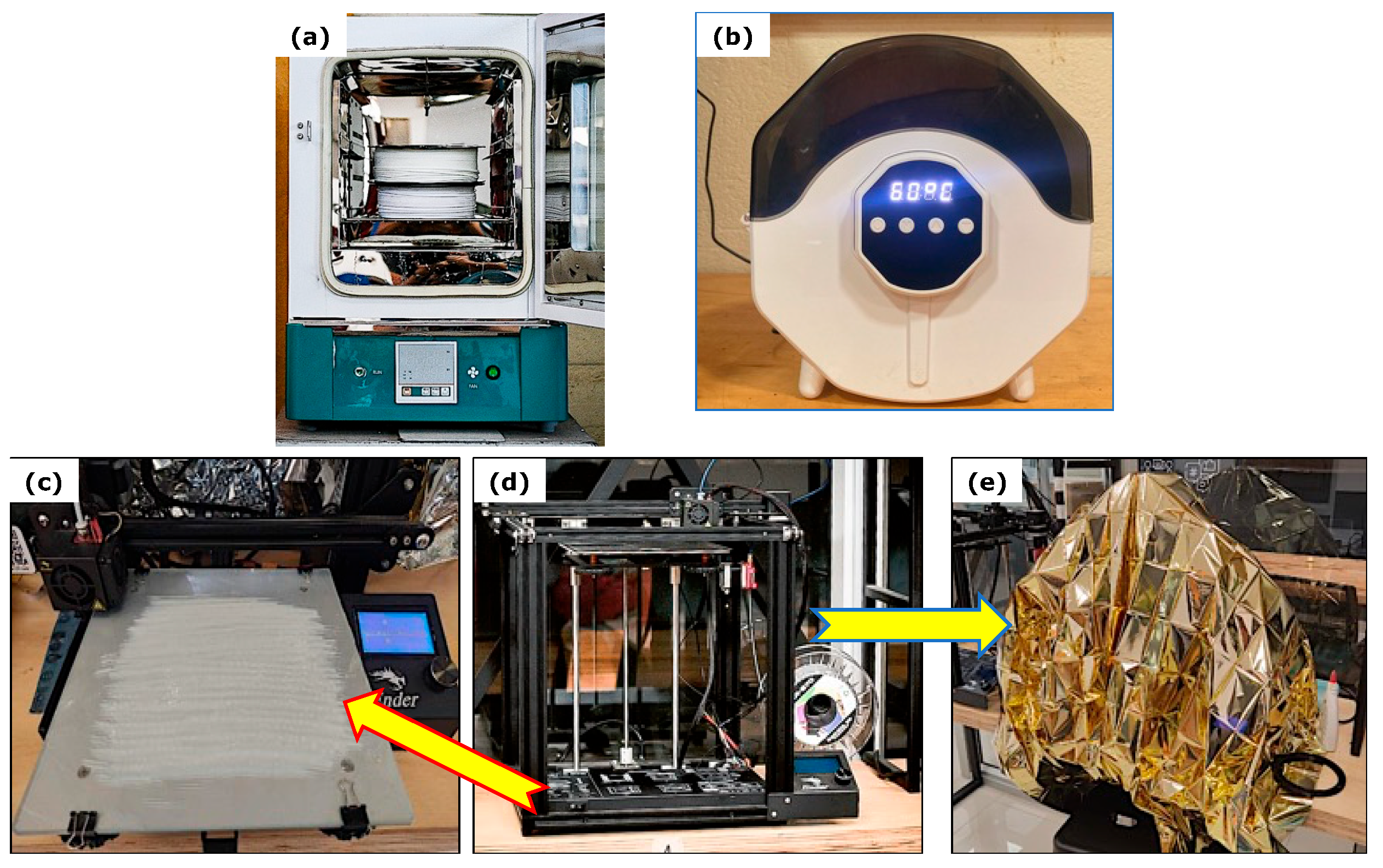 Figure 1. (a) Nylon filament drying oven, (b) Chamber used to keep the filament dry, (c) Tempered glass printing bed coated with PVA solution, (d) Creality Ender-3 FDM 3D printer, and (e) Thermal insulating blanket used to maintain low humidity and stable temperature conditions during printing.