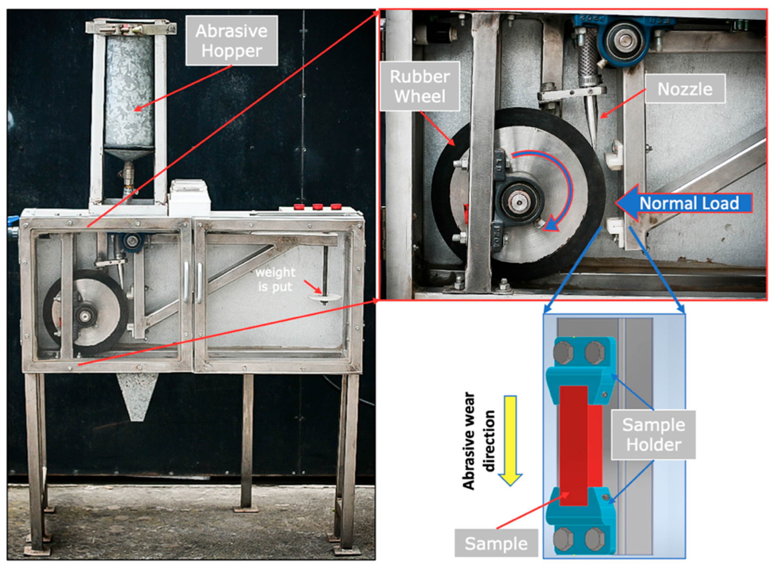 Figure 3. Abrasive wear testing machine setup based on ASTM G65 standard [22].