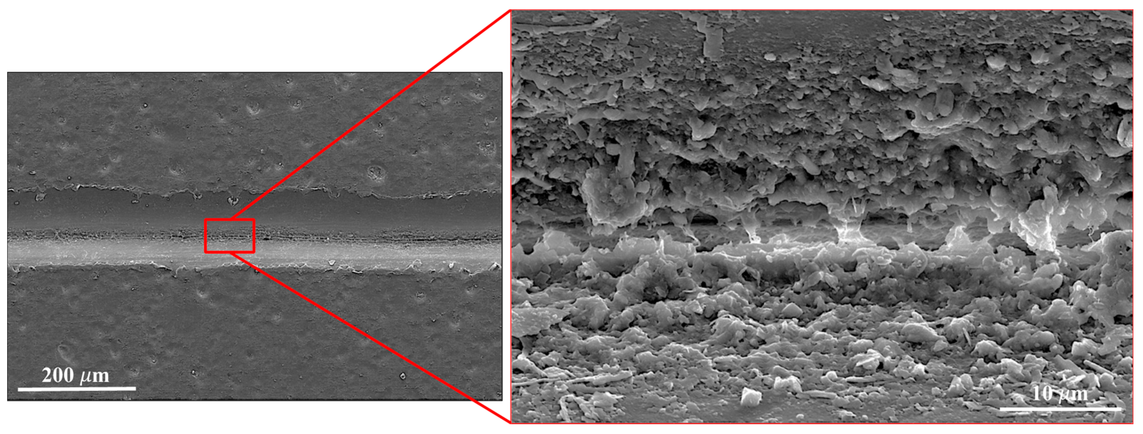 SEM analysis of sample C0 reveals the interface between adjacent filaments (Figure 5), showing the bonded area typical of the FDM process. The enlarged view highlights the contact zone, where partial fusion and extruded shape define surface continuity. These FDM-specific features match those reported in previous studies [31].