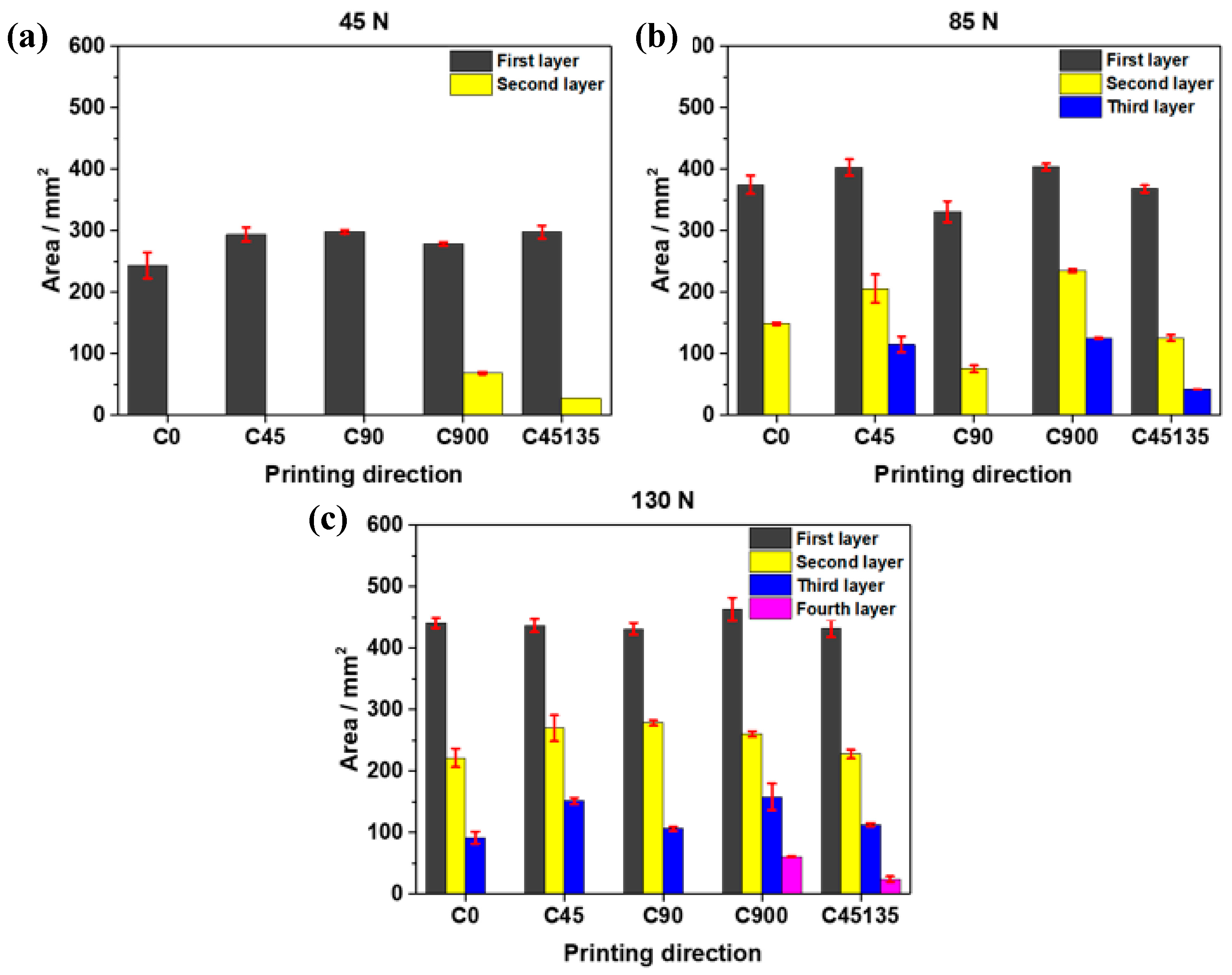 Table 2. Average worn area (mm2) and standard deviation of each exposed layer for nylon samples printed with different directions under normal loads of 45, 85, and 130 N.