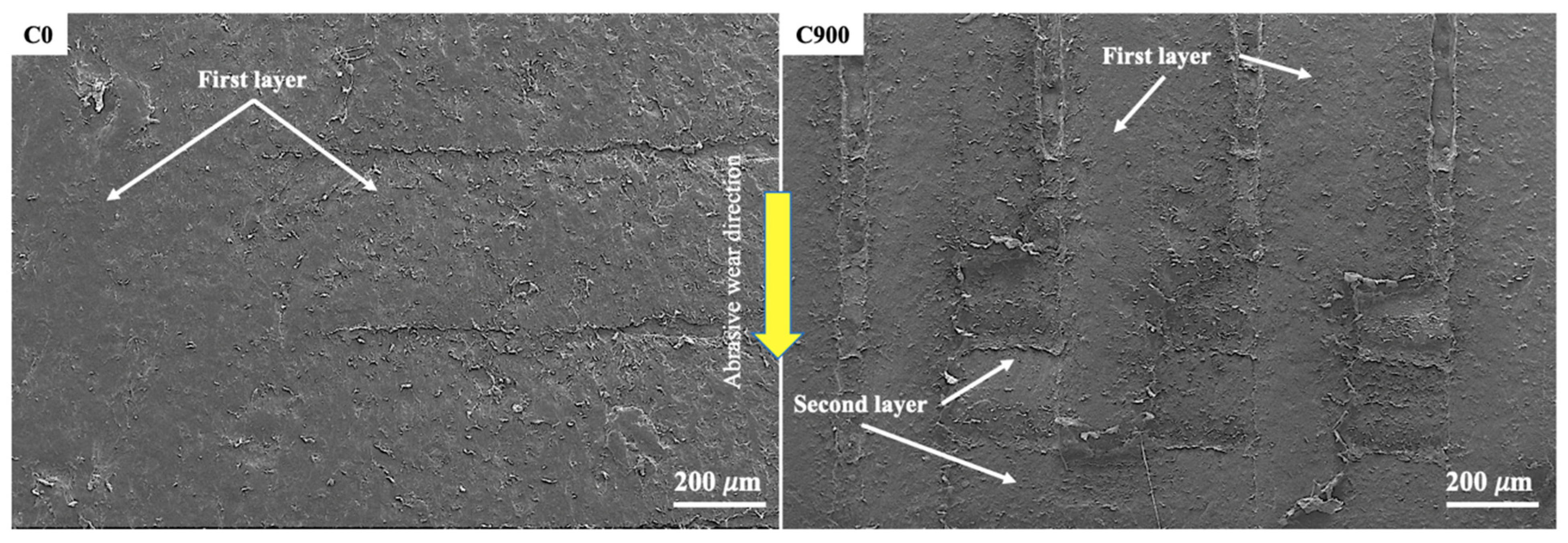 Figure 8. SEM images of samples C0 and C900 show abrasive wear in an enlarged region of the total worn area. Showing the layers exposed to a normal load of 45 N.
