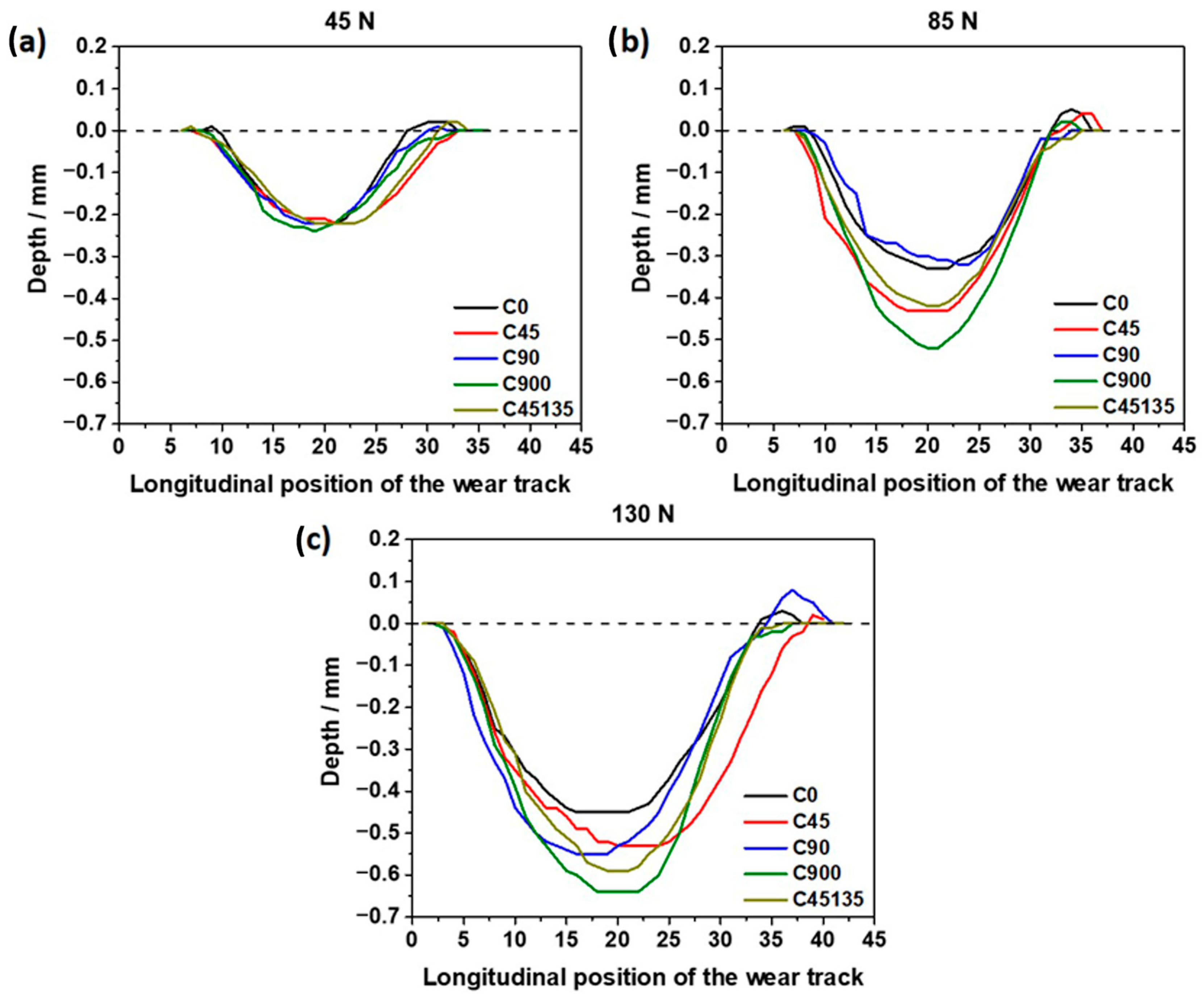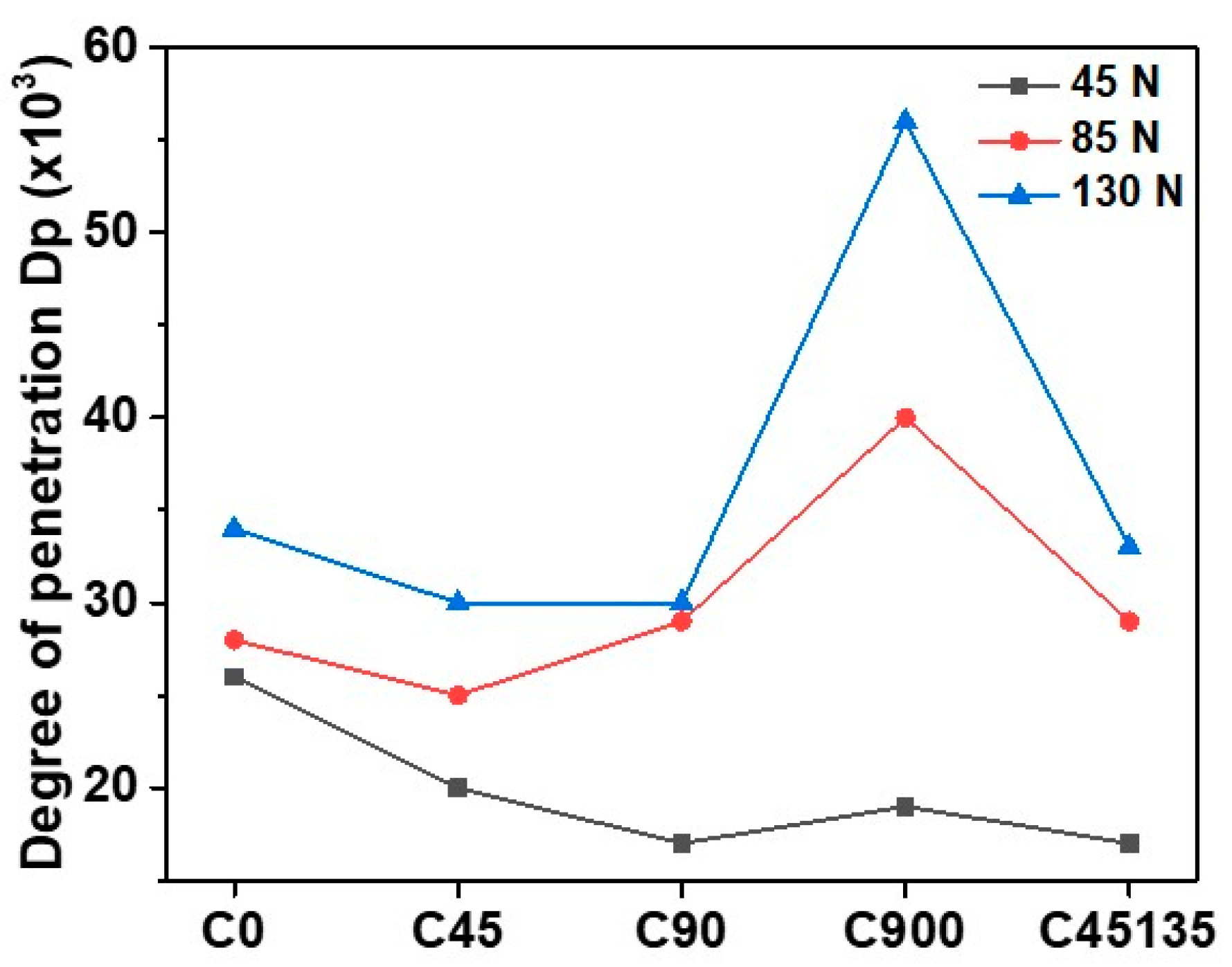 Sample C45 presents very similar Dp values under loads of 85 N and 130 N, which coincides with the results in Figure 7b, where the exposure of three consecutive layers as a result of wear is observed. This localized exposure amplifies the wear depth and increases the Dp to 85 N.