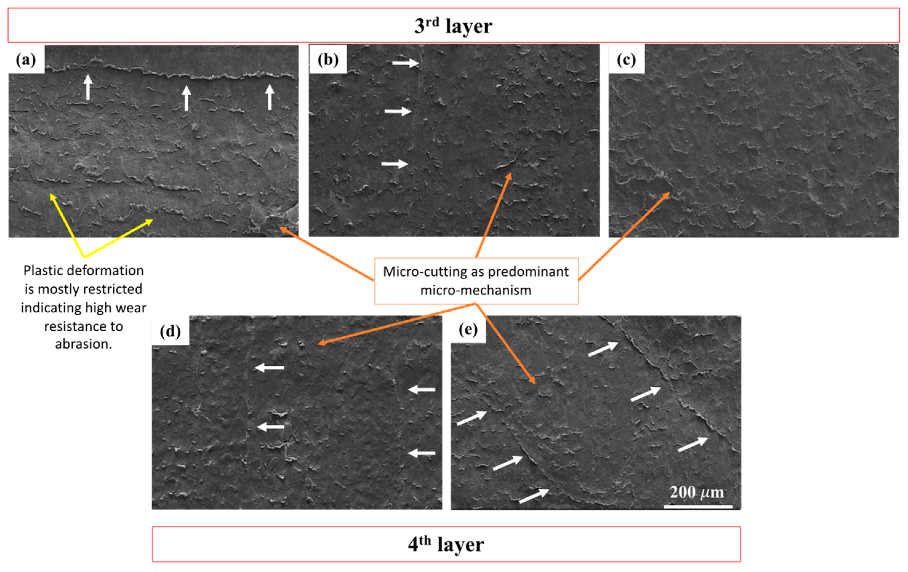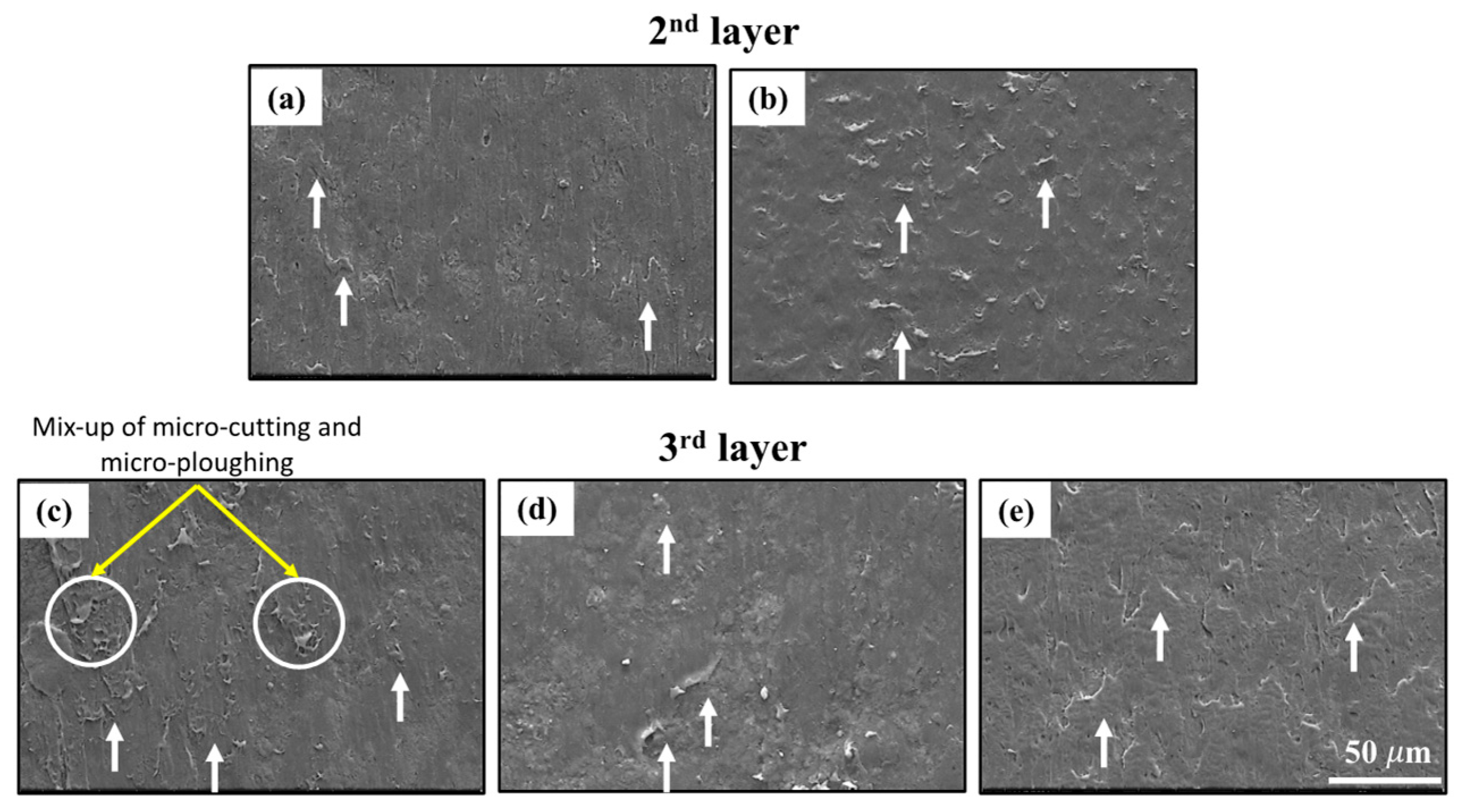 As shown in Figure 13, the SEM images display the worn surfaces of the nylon samples subjected to a normal load of 85 N for the different printing orientations. The layer exposure process is progressive at this load, with the exposure of the second and third layers. As the top layer detaches, the severity of wear tends to slow down, as part of the abrasive action is consumed in removing the surface layer before significantly affecting the underlying material. As a result, a lower cumulative wear severity than expected for this load is observed, accompanied by greater plastic deformations and a more uniform worn surface, with more visible material accumulations, indicated by white arrows. Under these conditions, wear progresses towards a transition stage from the micro-mechanism of micro-plowing to micro-cutting, evidenced by the presence of regions with plastic deformation oriented in the wear direction.
