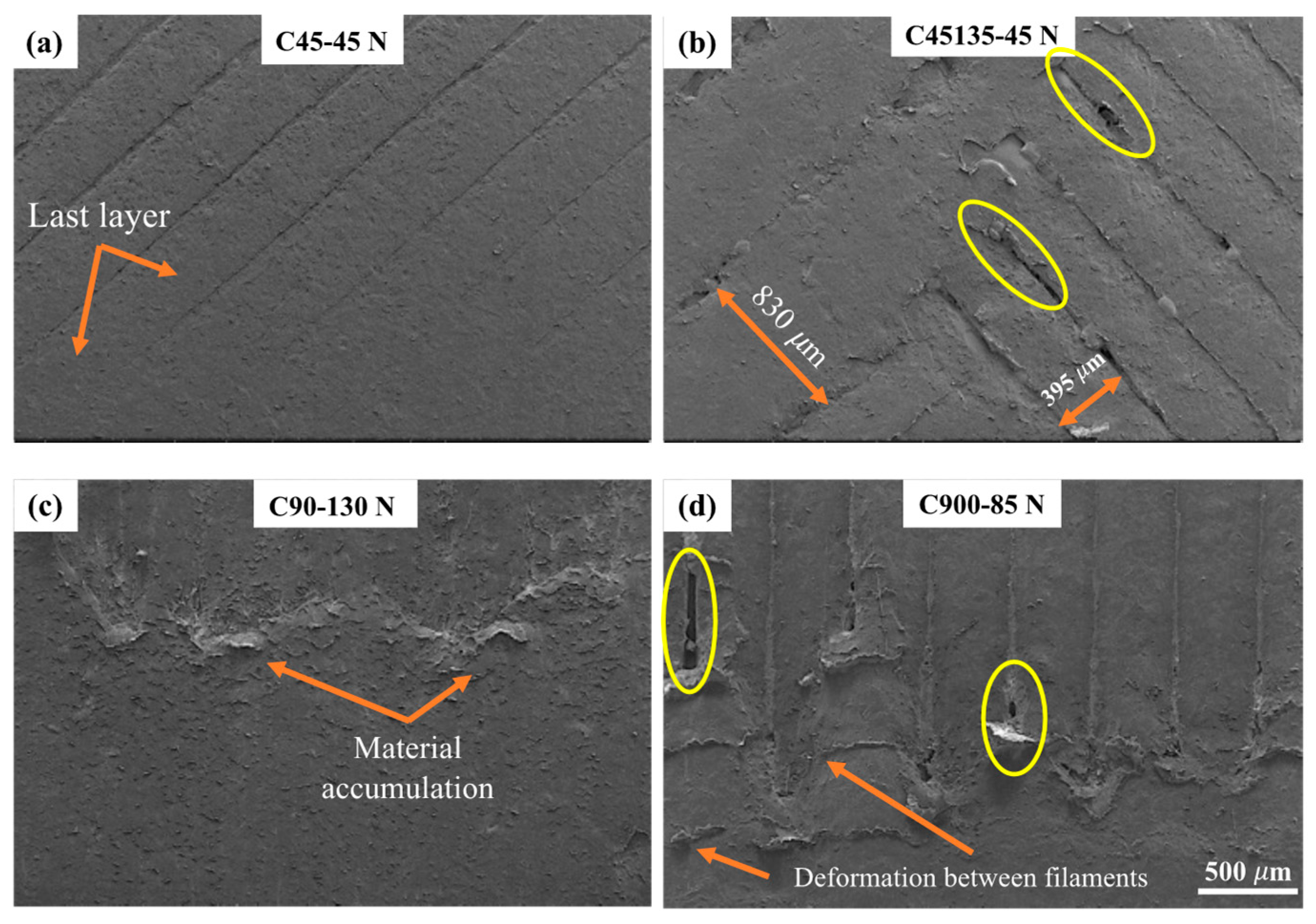 Figure 15. SEM images of different nylon samples under various normal loads: (a) C45 at 45 N, (b) C45135 at 45 N, (c) C90 at 130 N, and (d) C900 at 85 N. Orange arrows indicate the exposed layer, material accumulation, and deformation between filaments. Yellow circles highlight separations and discontinuities at the filament junctions, while in (b) the spacing between deposited filaments is also indicated.