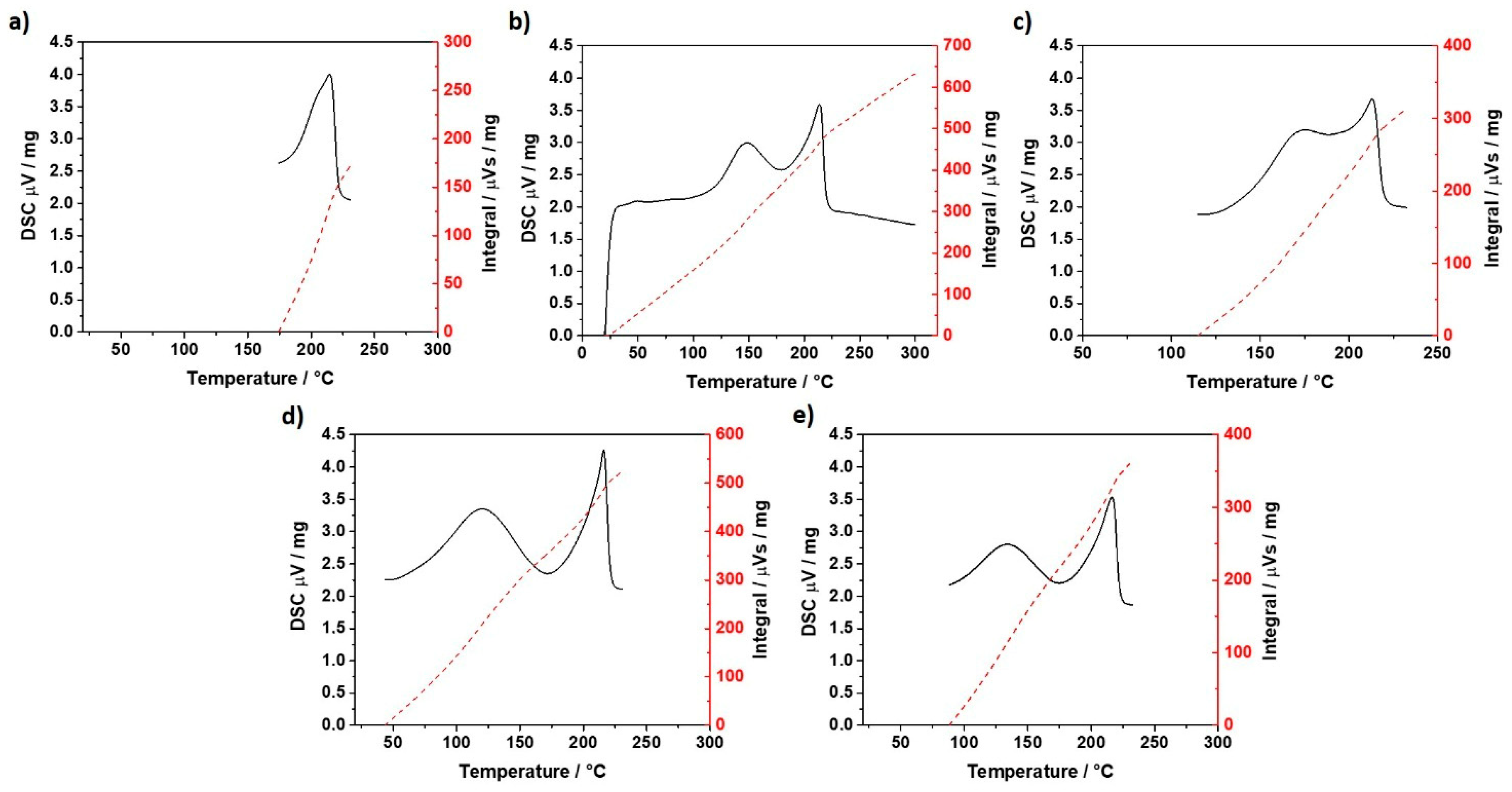 Figure 16 and Figure 17 present the thermal analysis of the materials described in this section. Each Figure includes the DSC integral curve. This curve is calculated as the area under the heat flow curve and provides a quantitative measure of the total enthalpy change associated with melting. The peak temperature, Ts, observed in the DSC results, corresponds to the maximum point of the endothermic peak. This point indicates the temperature at which the material undergoes melting.