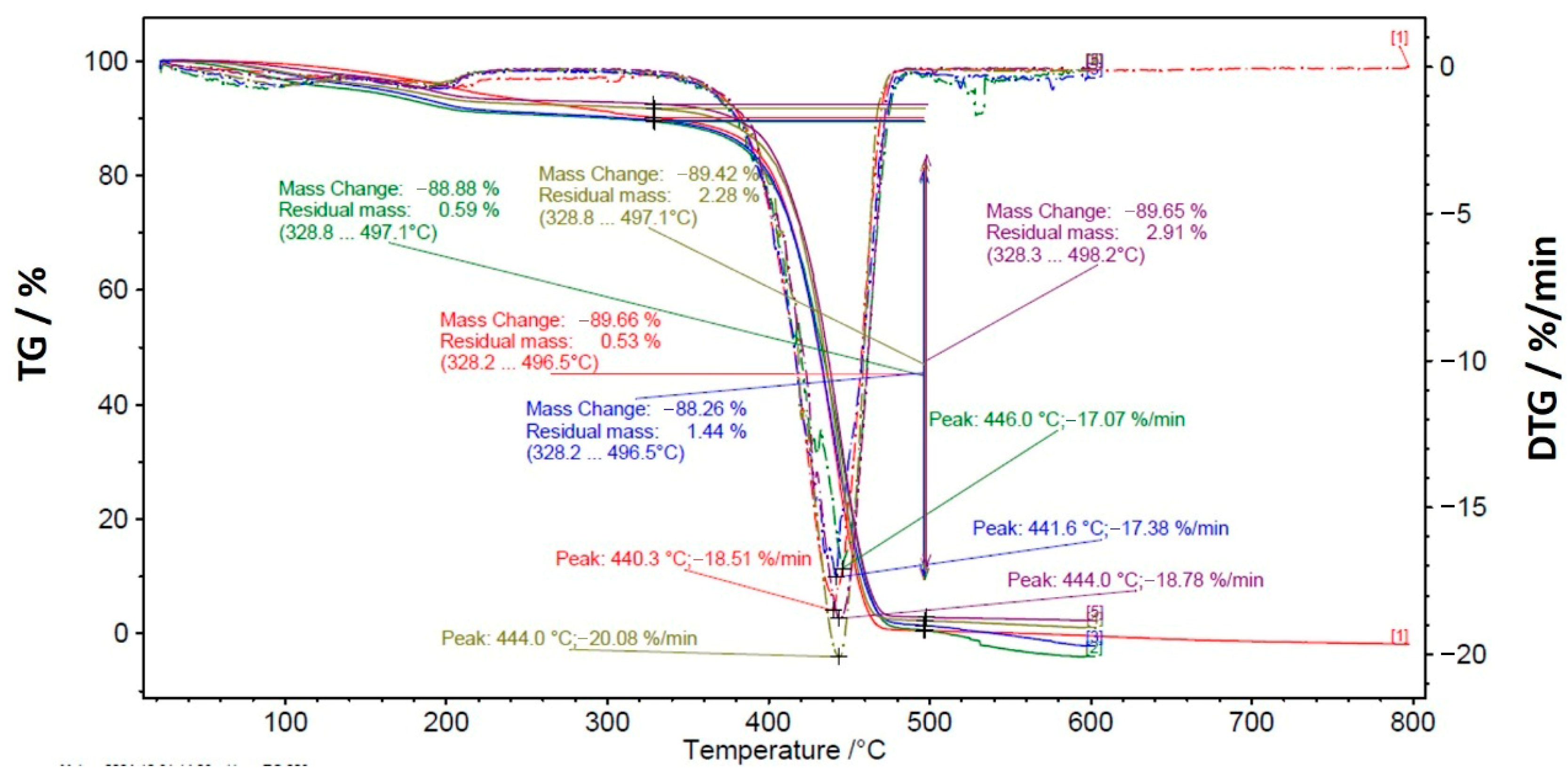 Figure 17 shows the TGA. TGA results did not reveal significant differences in mass loss among the tested samples. The peak temperature associated with the decomposition occurred at approximately 440 °C (Td) for all samples. At around 500 °C, the nylon mass was completely transformed to the gaseous phase. This suggests that the printing process and wear conditions do not alter the overall thermal stability or chemical composition of the nylon.