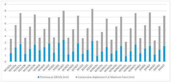 The compressed thickness is strongly linked to other measurable material characteristics. The thickness at 200 kPa correlates closely with the original thickness at 1 kPa (r = 0.9476), while the compressive displacement is highly correlated with the original thickness (r = 0.9755) and somewhat less with mass per unit area (r = 0.8821) (Table 3). This confirms that the compressed thickness can be reliably estimated from basic properties and reinforces its role as the most relevant predictor for subsequent thermal behavior.