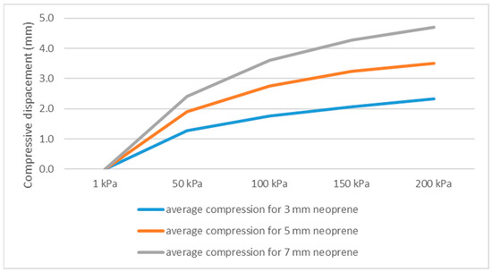 Initial thickness of the neoprene compared to thickness under compressive stress of 200 kPa.