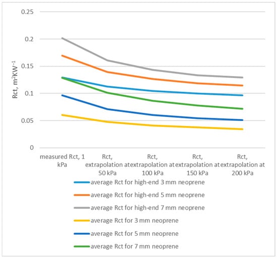 The results of the extrapolation are presented in Figure 2 for all analyzed neoprene samples. Based on the initial thickness and mass of each neoprene, and by applying the thickness at 200 kPa into the previously defined multiple regression equation—which describes the relationship between thickness, mass, and thermal resistance—the estimated thermal resistance was found to decrease between 19.3% and 53.2%, with an average reduction of 40.9%. This suggests that at a depth of 20 m, neoprene loses approximately 40.9% of its thermal insulating capacity.