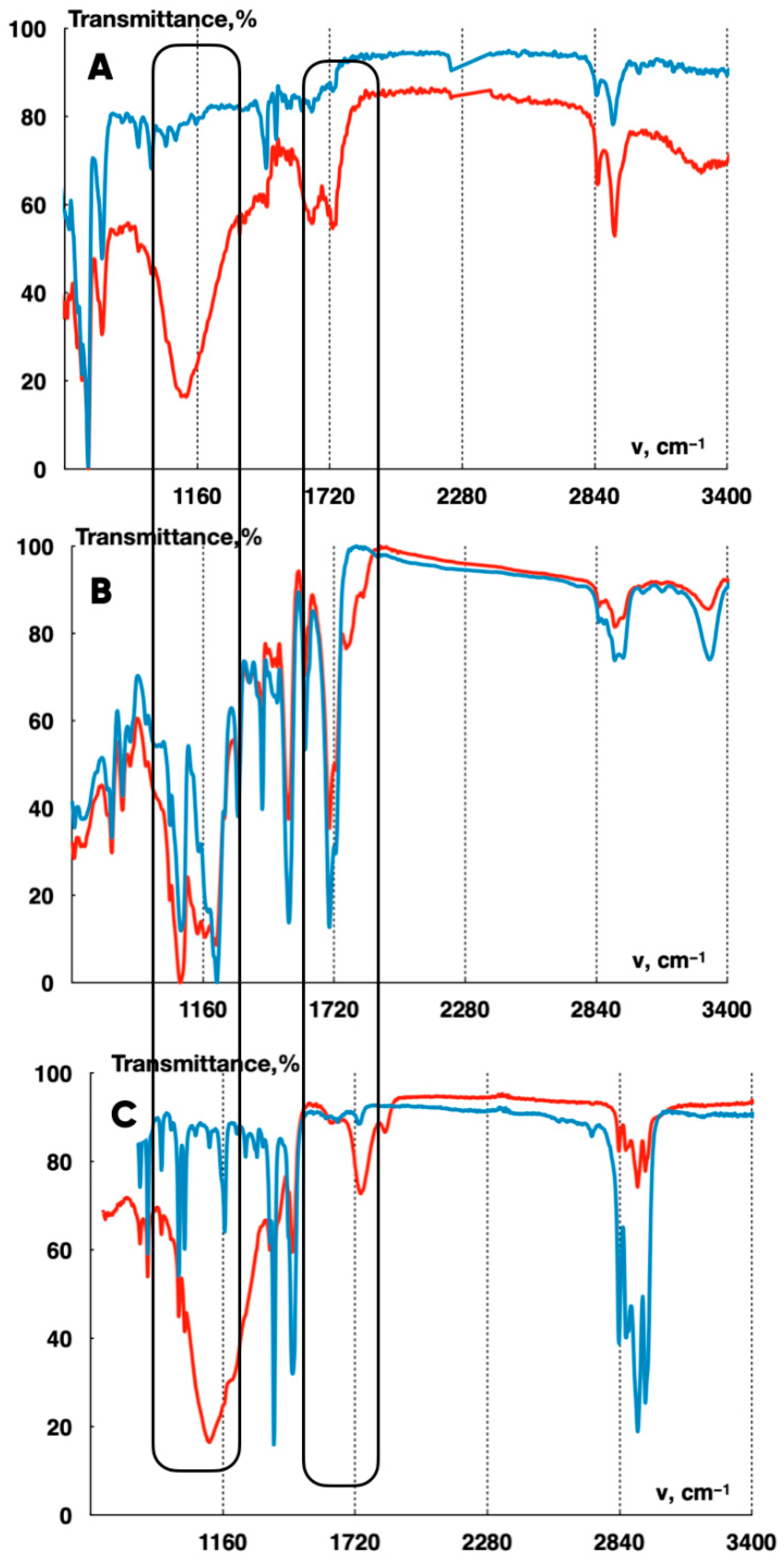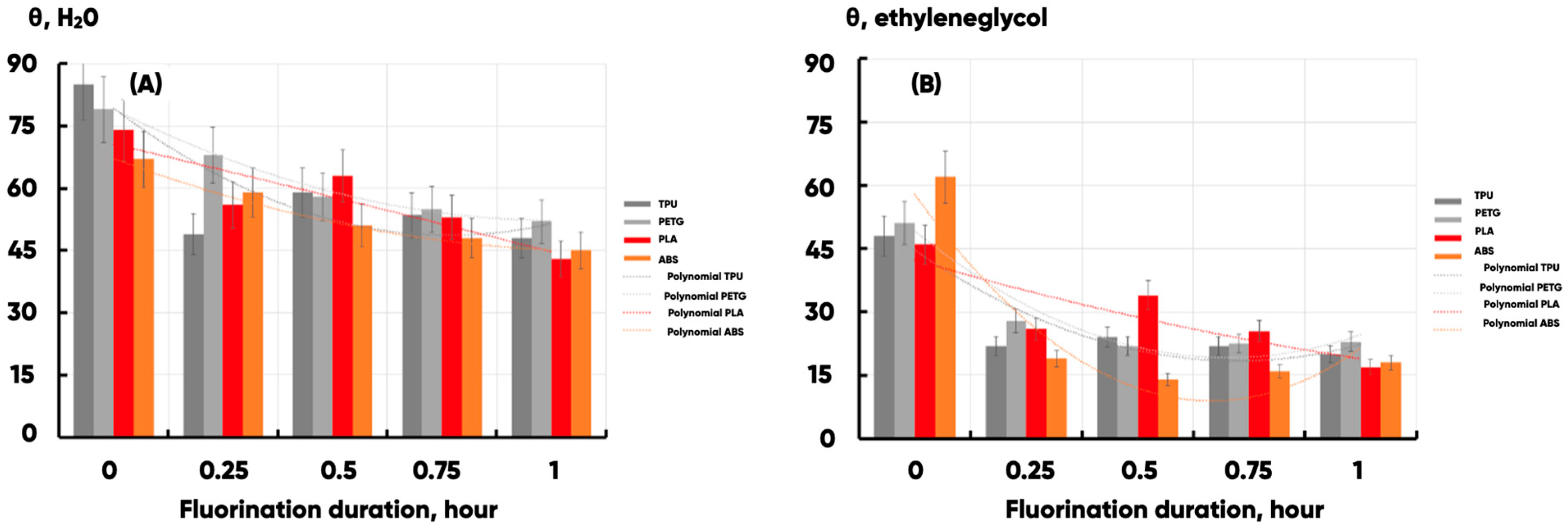 - The presence of unsaturated bonds in the 3D-printed polymers’ macromolecules (Table 5), which contribute to the intensive course of fluorine addition reactions.