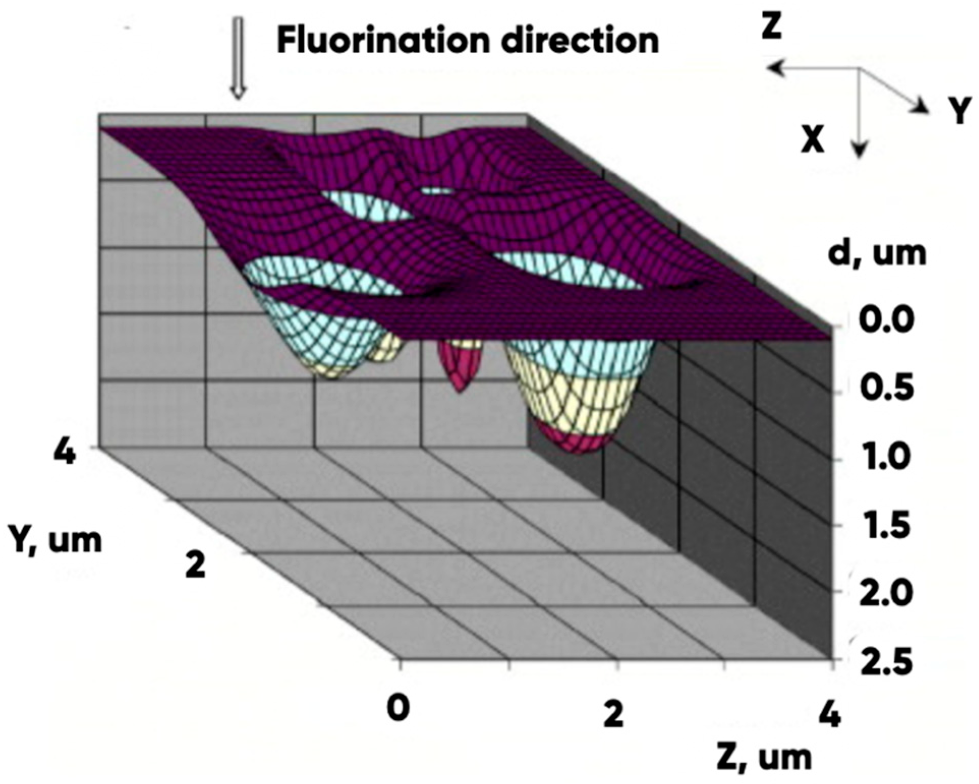 - The presence of pores (with the diameters of 50 nm or more) in the initial and in the modified experimental samples structure contributing to the effective diffusion of the active reagent (fluorine) and significantly increasing the interaction with the modified gas mixture 3D-printed product surface area (Figure 5).