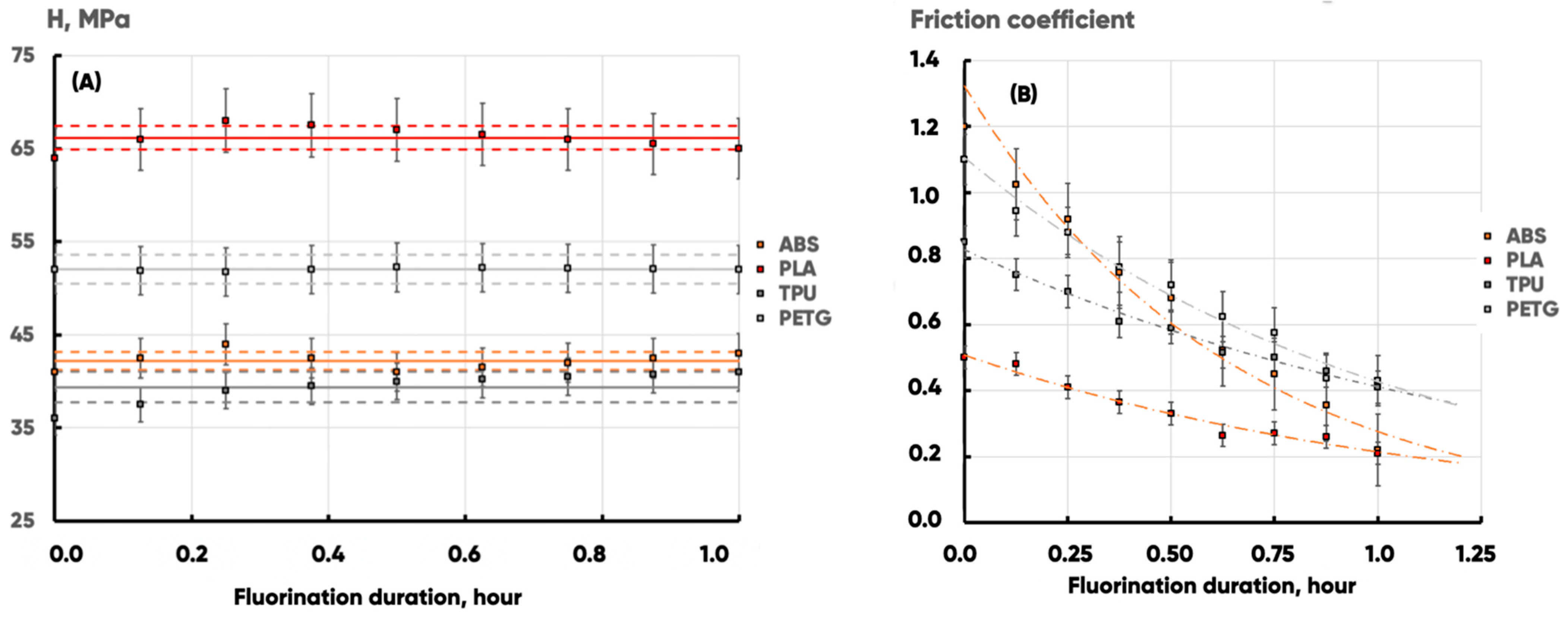 | Fluorination Duration, Hour | 3D-Printing Material | |||||||