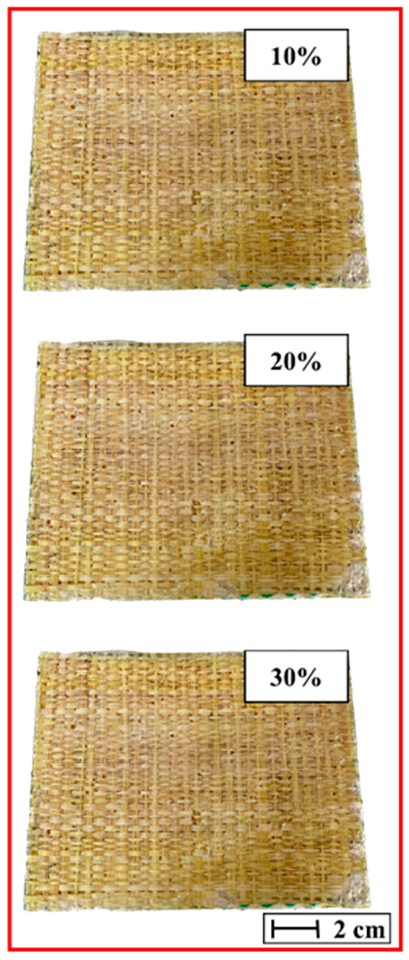 Another limitation is the interfacial adhesion between the epoxy matrix and the raffia fabric, especially in composites with higher fiber content (ER20 and ER30), where failures such as delamination and fiber pullout were observed. To overcome this challenge, chemical modifications to the fibers, such as silanization or the use of compatibilizers, can be applied, as well as adjustment of the polymer matrix formulation to improve chemical affinity and load transfer between the constituents.