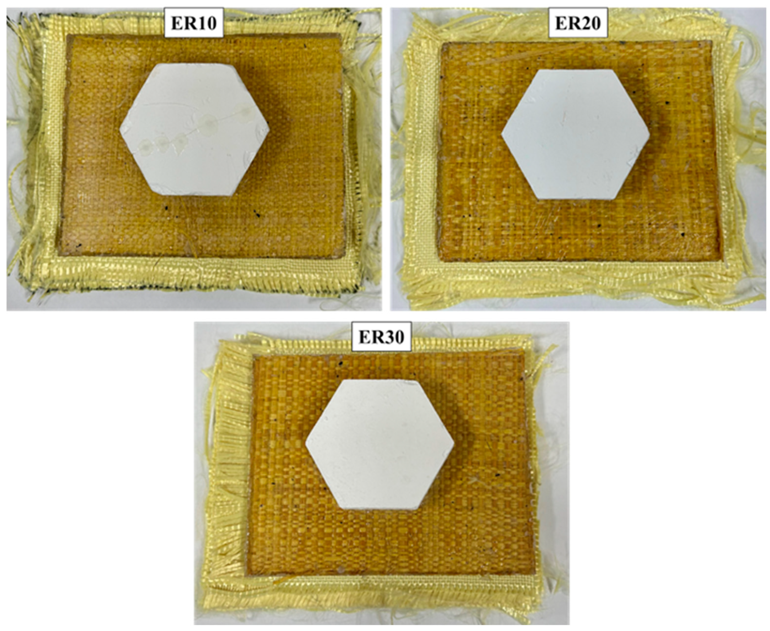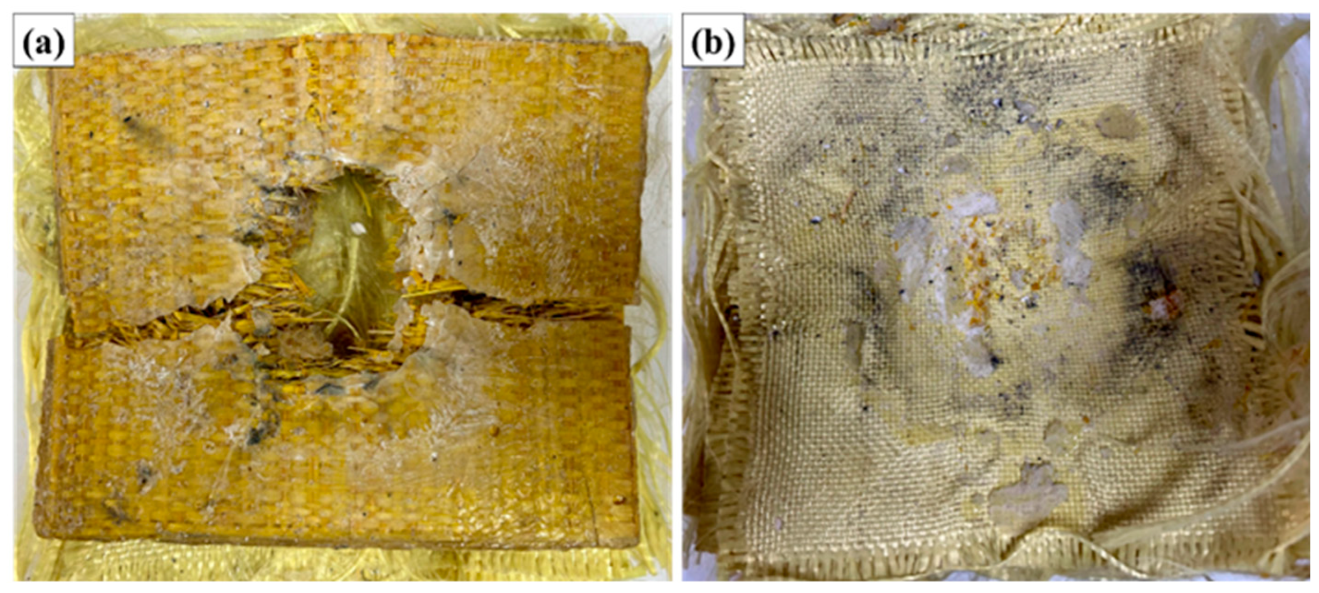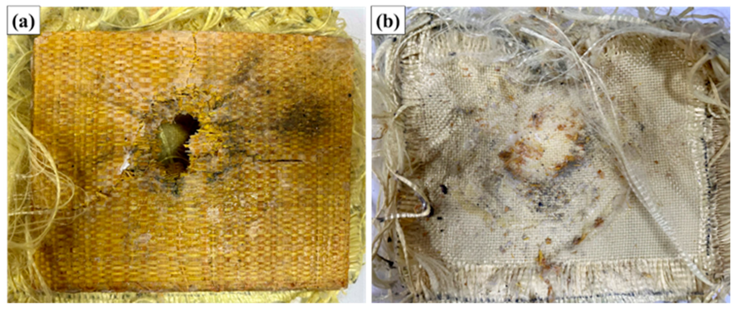 Figure 9 illustrates the appearance of the MAS with 30% fiber volume (ER30) after ballistic testing with 7.62 mm ammunition.