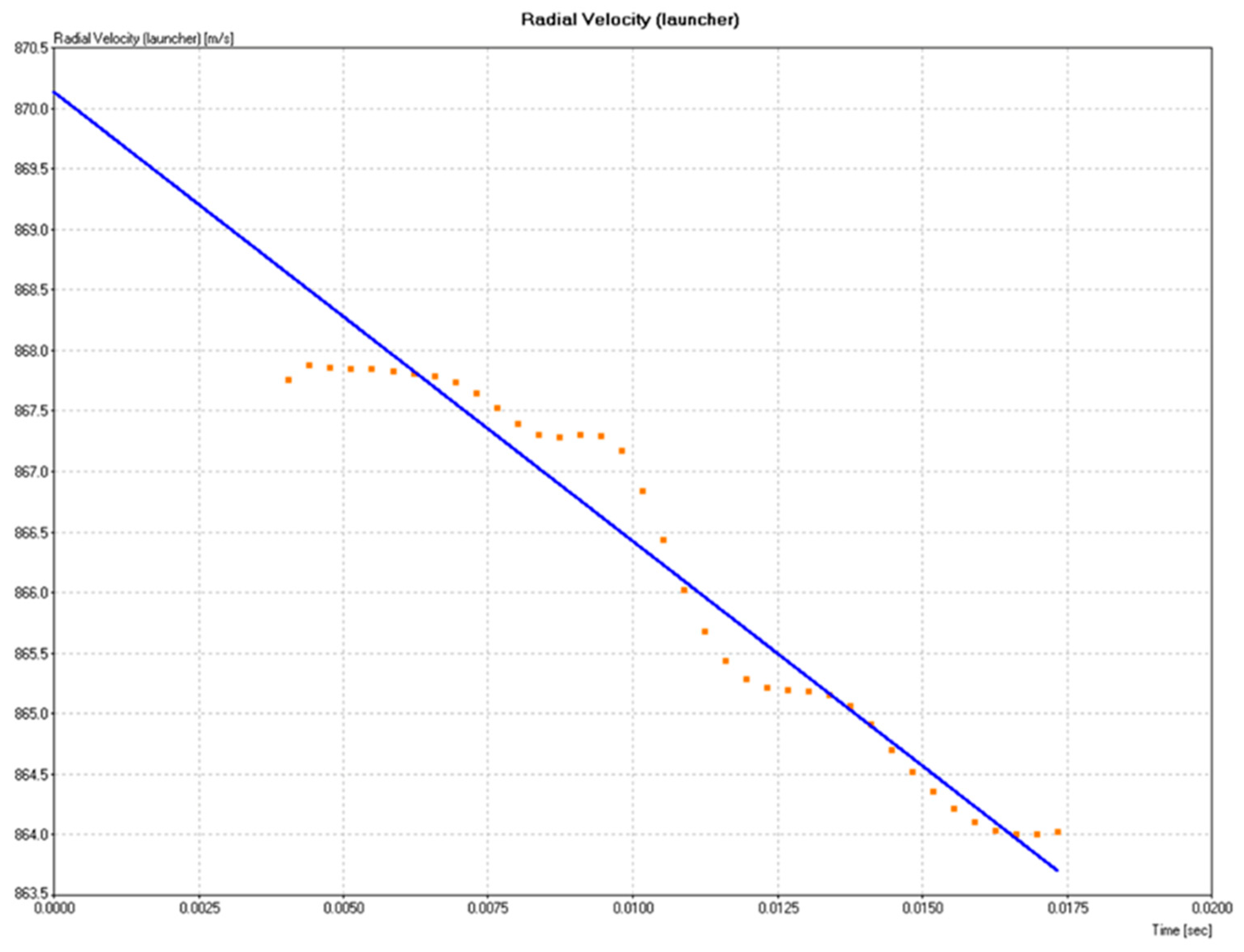 The initial velocity recorded was approximately 870 m/s, a value consistent with high-caliber ammunition (7.62 mm) used in armor testing. The blue curve represents the expected linear trend for projectile deceleration in an idealized system, while the orange points correspond to the experimental data obtained during impact.