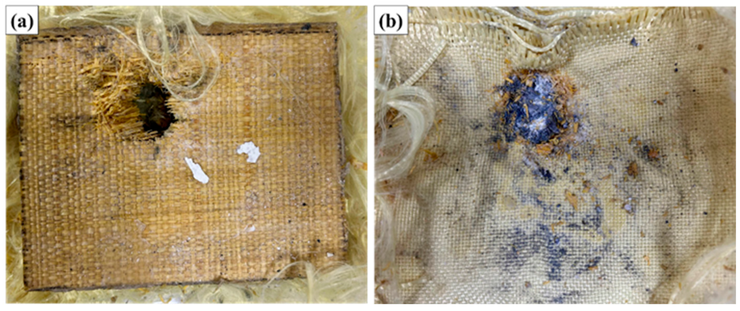 Furthermore, analysis of the rear face (side in contact with the ballistic clay) shows accumulation of debris and evident textile deformation in the layers of aramid fabric, corroborating that there was a significant transfer of kinetic energy to this region. The presence of abrasion marks, burned regions, and textile collapse zones indicates that the projectile transferred high energy to the structure, resulting in progressive failures.