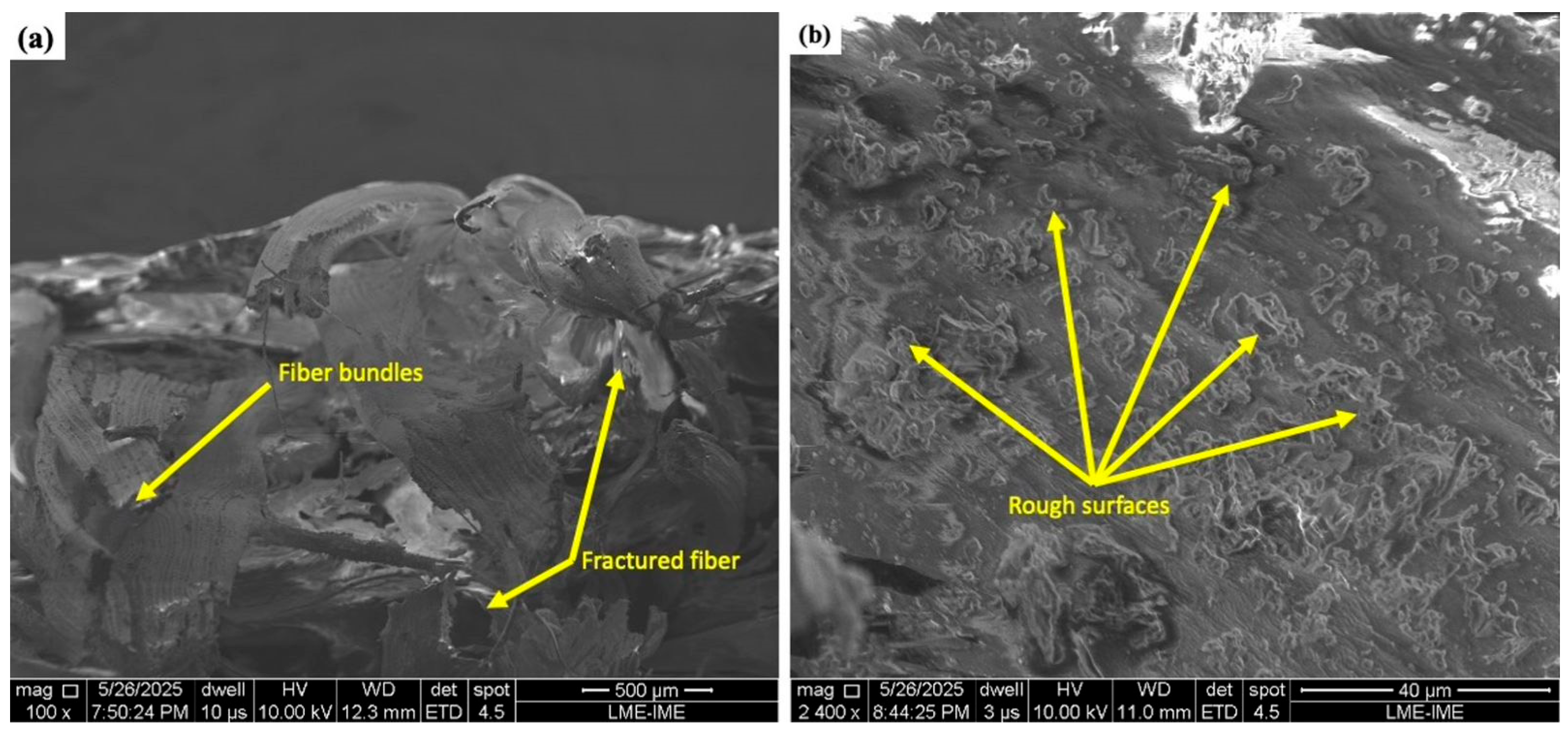 Although the present work did not experimentally evaluate processing modifications, the SEM observations suggest that some strategies, such as vacuum-assisted impregnation, mild alkaline or silane surface treatments, and post-curing optimization, could be explored in future studies to mitigate porosity and improve fiber–matrix adhesion. These approaches are therefore proposed as prospective methods for further improving interfacial uniformity and structural reliability, rather than as confirmed results of this investigation.