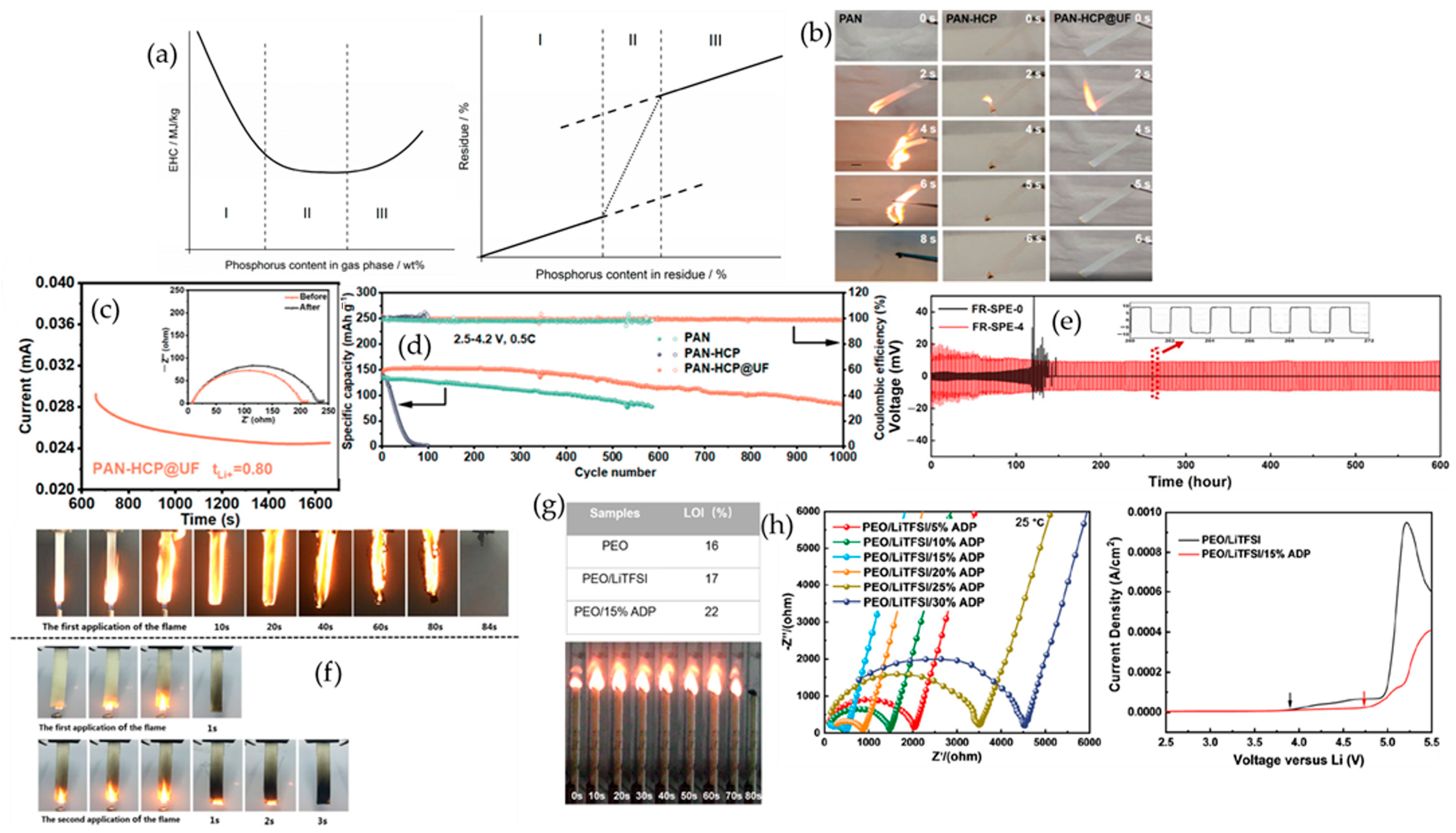 - Han, L.; Wang, L.; Chen, Z.; Kan, Y.; Hu, Y.; Zhang, H.; He, X. Incombustible Polymer Electrolyte Boosting Safety of Solid-State Lithium Batteries: A Review. Adv. Funct. Mater. 2023, 33, 2300892. [Google Scholar] [CrossRef]