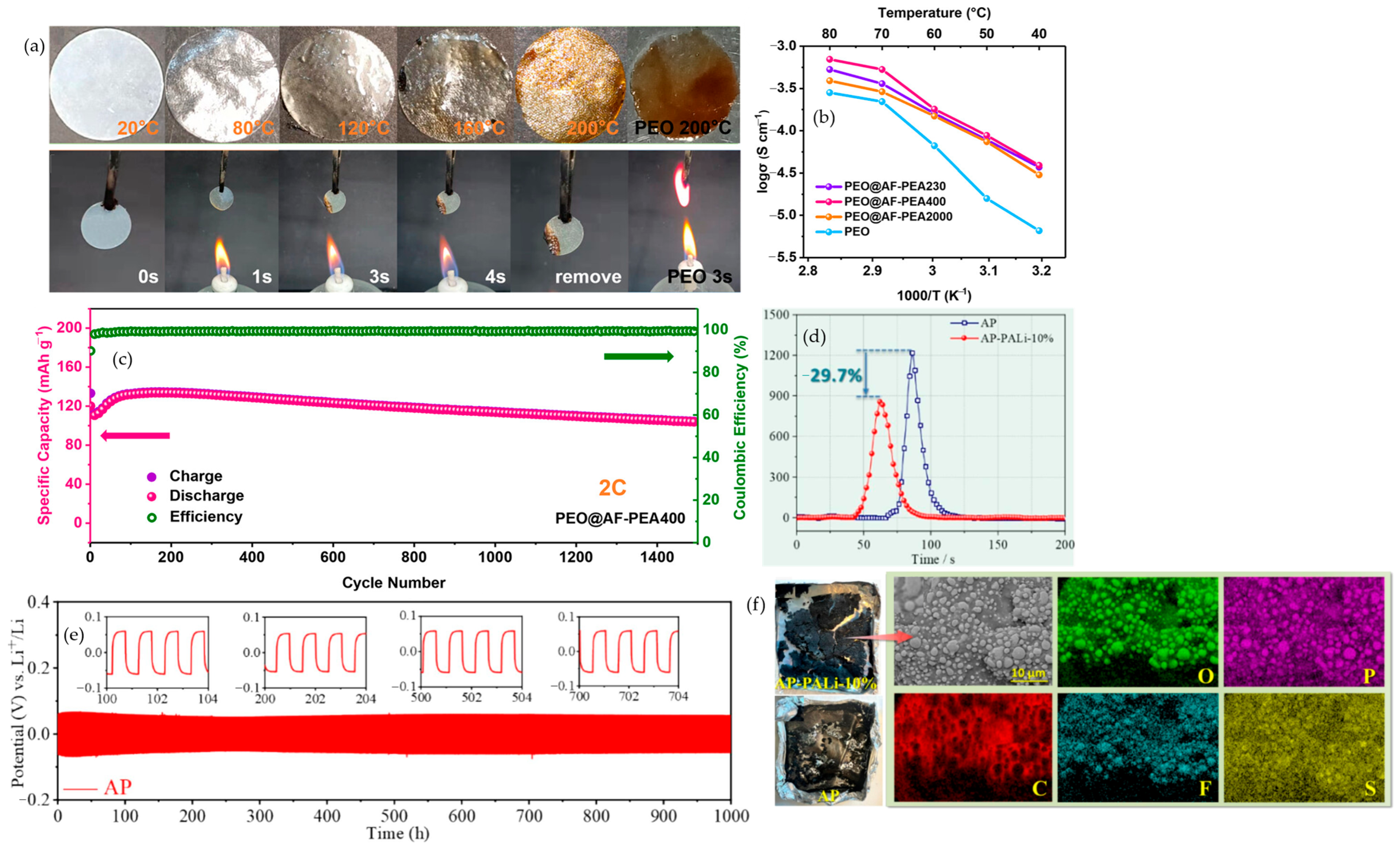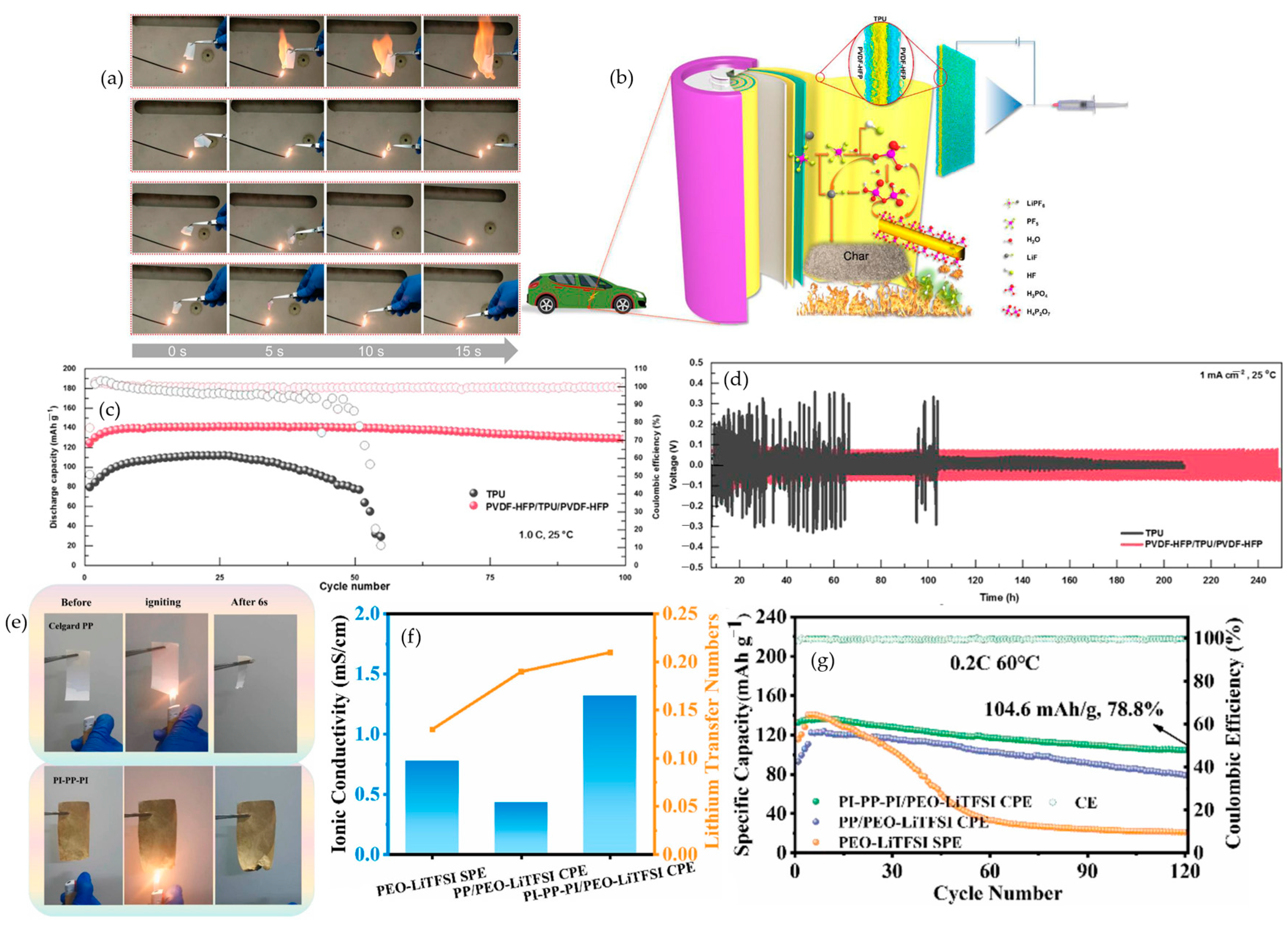 - Wu, M.; Han, S.; Liu, S.; Zhao, J.; Xie, W. Fire-Safe Polymer Electrolyte Strategies for Lithium Batteries. Energy Storage Mater. 2024, 66, 103174. [Google Scholar] [CrossRef]