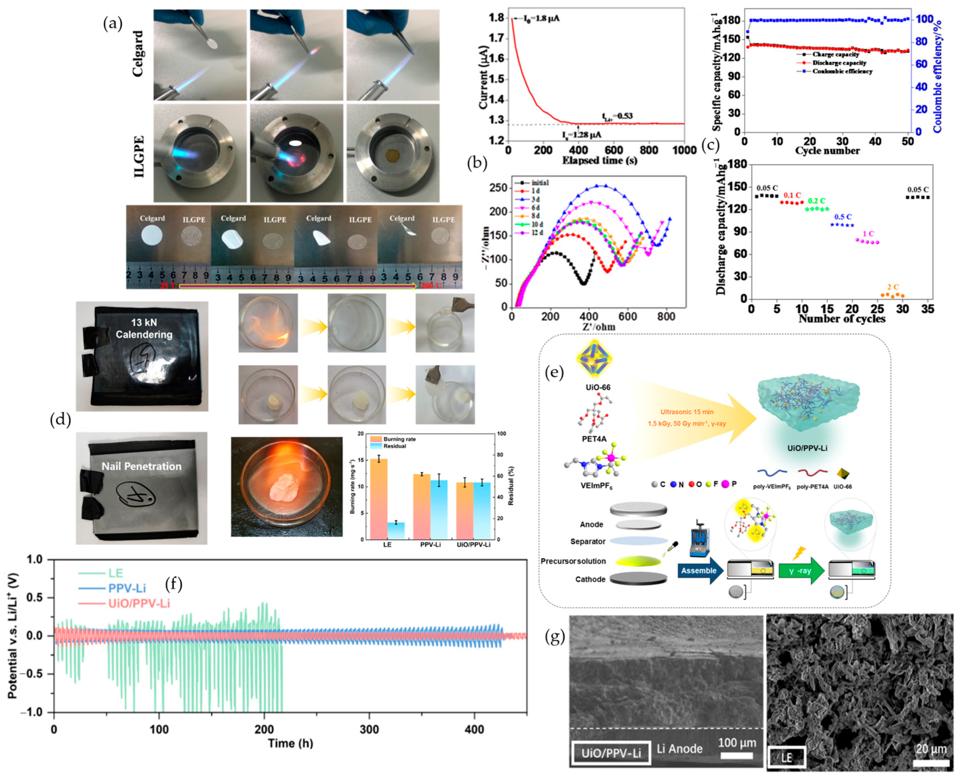 - Xie, M.; Zhang, Z.; Wang, Y.; Jiang, F.; Tang, H.; Li, J.; Jiao, S.; Qiu, J.; Peng, J.; Chen, X.; et al. In-Situ Radiation-Synthesized UiO-66/Poly(Ionic Liquid) Gel Electrolyte with High Conductivity, Wide Electrochemical Window and Flame Retardancy for High Performance Lithium Metal Batteries. Energy Storage Mater. 2025, 82, 104551. [Google Scholar] [CrossRef]