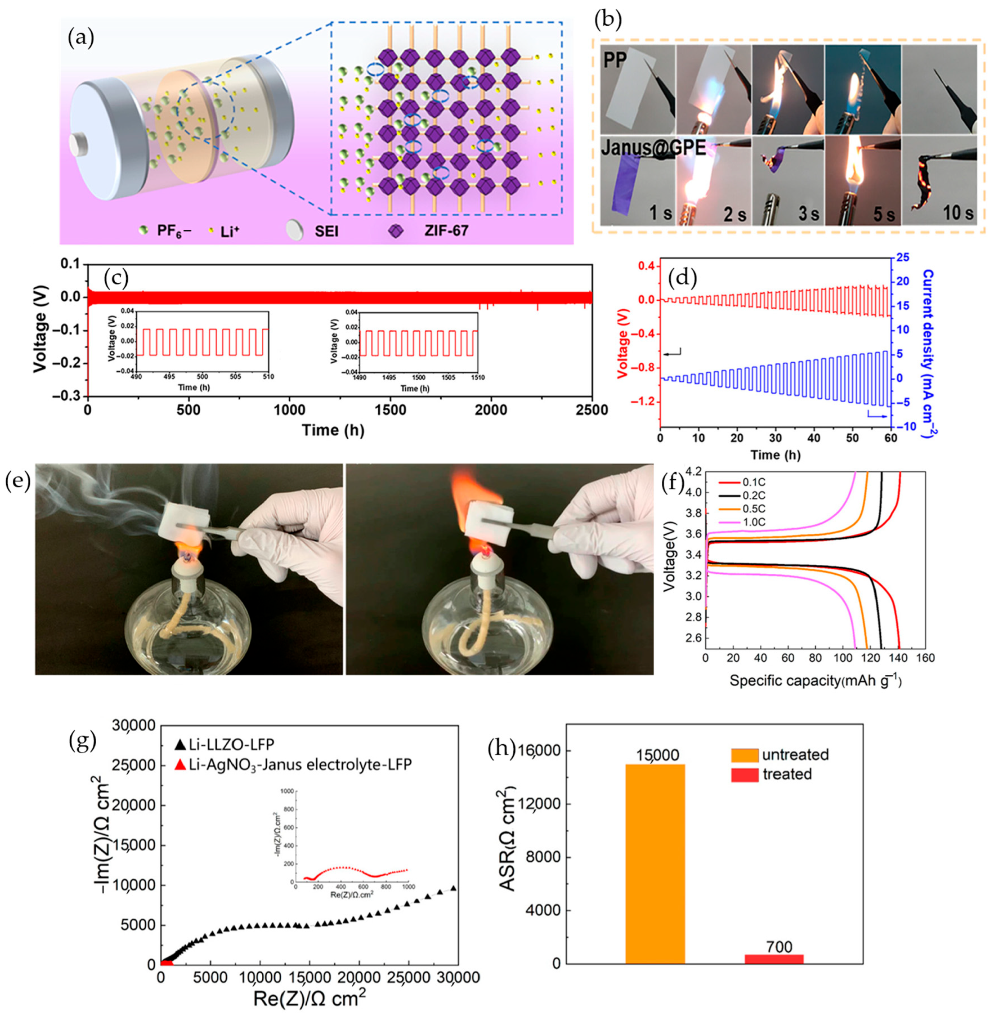 - Li, C.; Liu, G.; Wang, K.; Dong, W.; Han, J.; Yu, Y.; Min, Z.; Yang, C.; Lu, Z. Electrochemically-Matched and Nonflammable Janus Solid Electrolyte for Lithium-Metal Batteries. ACS Appl. Mater. Interfaces 2021, 13, 39271–39281. [Google Scholar] [CrossRef]