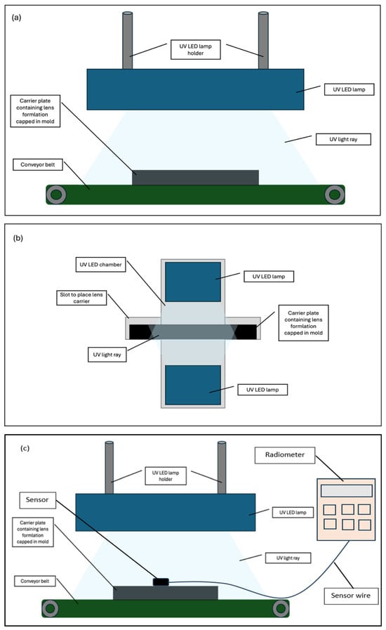 UV LED curing configurations. (a) UV LED SC for lens samples on moving conveyor belt. (b) UV LED DC for lens samples in static curing chamber. (c) UV LED light intensity measurement using Radiometer at static condition prior to commencing curing process.