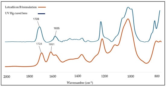 Figure 2 presents the FTIR spectra of Lotrafilcon B, along with a representative lens spectra of a lens cured using UV Mercury (Hg) lamps, as per the intensity and duration parameters outlined in Table 1. The spectral region between 1635 cm−1 and 1728 cm−1 corresponds to the characteristic absorption bands of the C=C and C=O functional groups present in the lens formulation mixture.