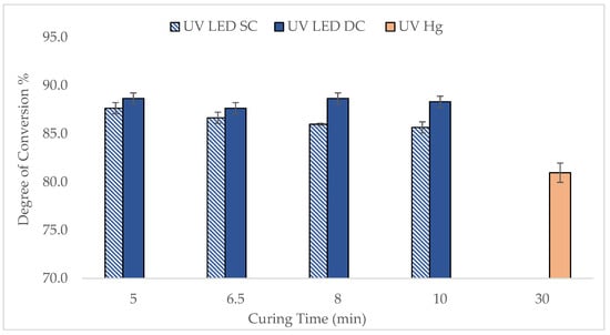 - Filho, J.D.N.; Poskus, L.T.; Guimarães, J.G.A.; Barcellos, A.A.L.; Silva, E.M. Degree of conversion and plasticization of polymeric matrices based ondimethacrylate: Influence of photopolymerization mode. J. Oral Sci. 2008, 50, 315–321. [Google Scholar] [CrossRef][Green Version]