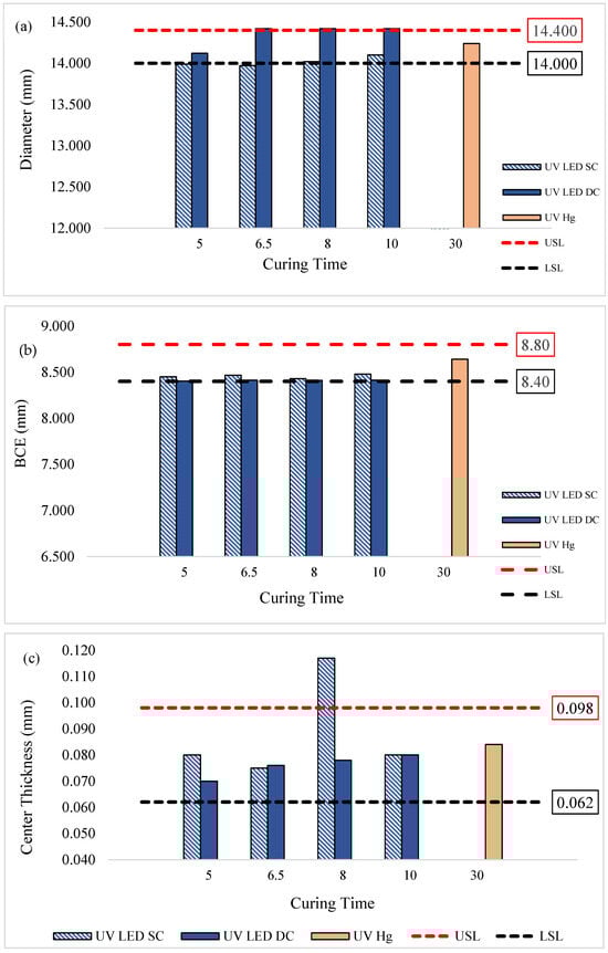 In contrast, UV LED in the DC configuration yielded lenses with diameters mostly above the upper specification limits (USL). This could be attributed to the targeted UV emission wavelength of the LED lamp, which delivers intense energy from top and bottom curing, resulting in rapid polymerization. Such rapid curing may trap unreacted monomers within the crosslinked networks, resulting in lenses that are less firm and more prone to flattening and enlargement when removed from the mold [18]. These findings are supported by the BCE data in Figure 4b, where BCE values were prone to be near the LSL, indicating a tendency toward flatter lenses compared to those cured by UV Hg.