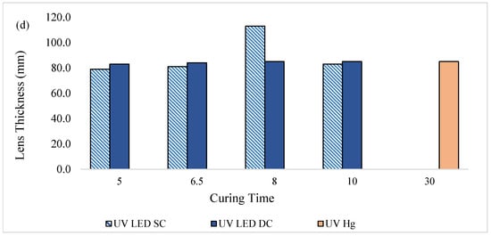 These physical property observations align with previous research, such as Young et al. [19], which emphasizes that changes in lens diameter necessitate corresponding adjustments in BCE to maintain a proper fit. Despite the reductions in diameter and BCE observed here, these variations are not concerning; smaller BCE values and diameters can facilitate better tear exchange and oxygen flow. Additionally, studies have indicated that a 0.4 mm change in BCE generally corresponds to a 0.2 mm change in diameter, which needs to be limited in order to sustain similar on-eye fit [20,21]. Therefore, the approximately 0.2 mm reduction in BCE in our UV LED-cured lenses aligns with an approximate 0.1 mm decrease in diameter, which remains within acceptable fitting ranges. Figure 4c and Figure 4d show the lens center thickness and overall lens thickness, respectively.