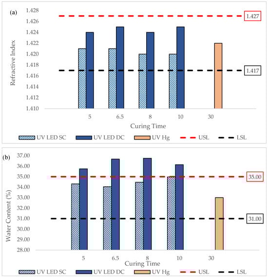 Figure 4 presents the refractive index (RI) with the corresponding water content of lenses cured by UV LED and UV Hg. As shown in Figure 5a, the RI of lenses cured under both SC and DC configurations fell within the specification range and were comparable to UV Hg-cured lenses. Notably, the DC-cured lenses exhibited a slightly higher RI than those cured with UV LED in SC configuration or with conventional UV Hg lamps. In line with the higher DOC observed in DC-cured lenses in Section 3.1, this elevated RI may be associated with increased crosslinking density and more complete polymerization at the surface. According to literature, higher RI also indicates better optical quality of the lenses, which can enhance lens durability and visual clarity [22,23]. Typically, the RI of contact lenses exceeds 1.422, and changes in RI also reflect variations in the equilibrium water content of silicone hydrogel lenses.
