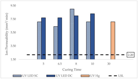 Ion permeability data of lenses cured by UV LED and UV Hg at various curing times.